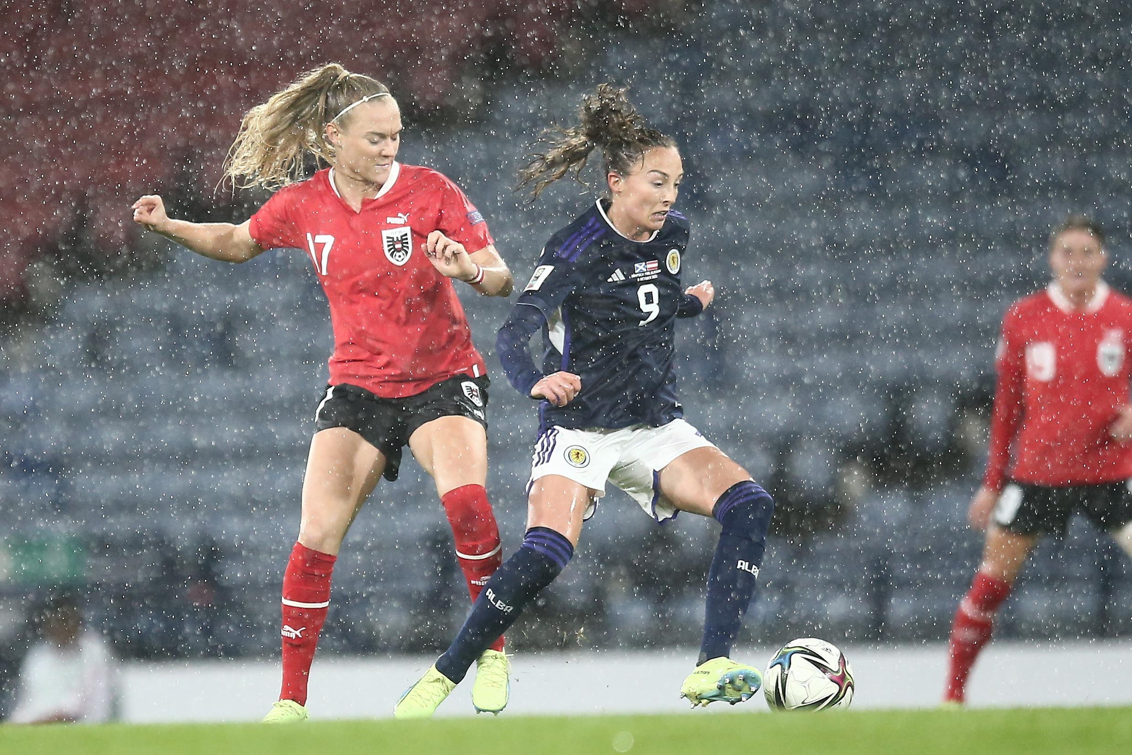 Starker Regen und teils heftiger Wind, das Wetter in Glasgow war auch am Spieltag so wie seit der Anreise der ÖFB-Teamkickerinnen in Schottland am Montag fast durchgehend. Die Gastgeberinnen fühlten sich dabei sichtlich wohler, machten vor der Pause das Spiel und überzeugten mit einem sehr ballsicheren Auftritt. Einziges Manko war, dass sie in der entscheidenden Zone nicht den Abschluss suchten. Dadurch blieb eine Rettungstat von ÖFB-Torfrau Manuela Zinsberger im Duell mit Stürmerin Martha Thomas (14.) vorerst auch die Einzige.