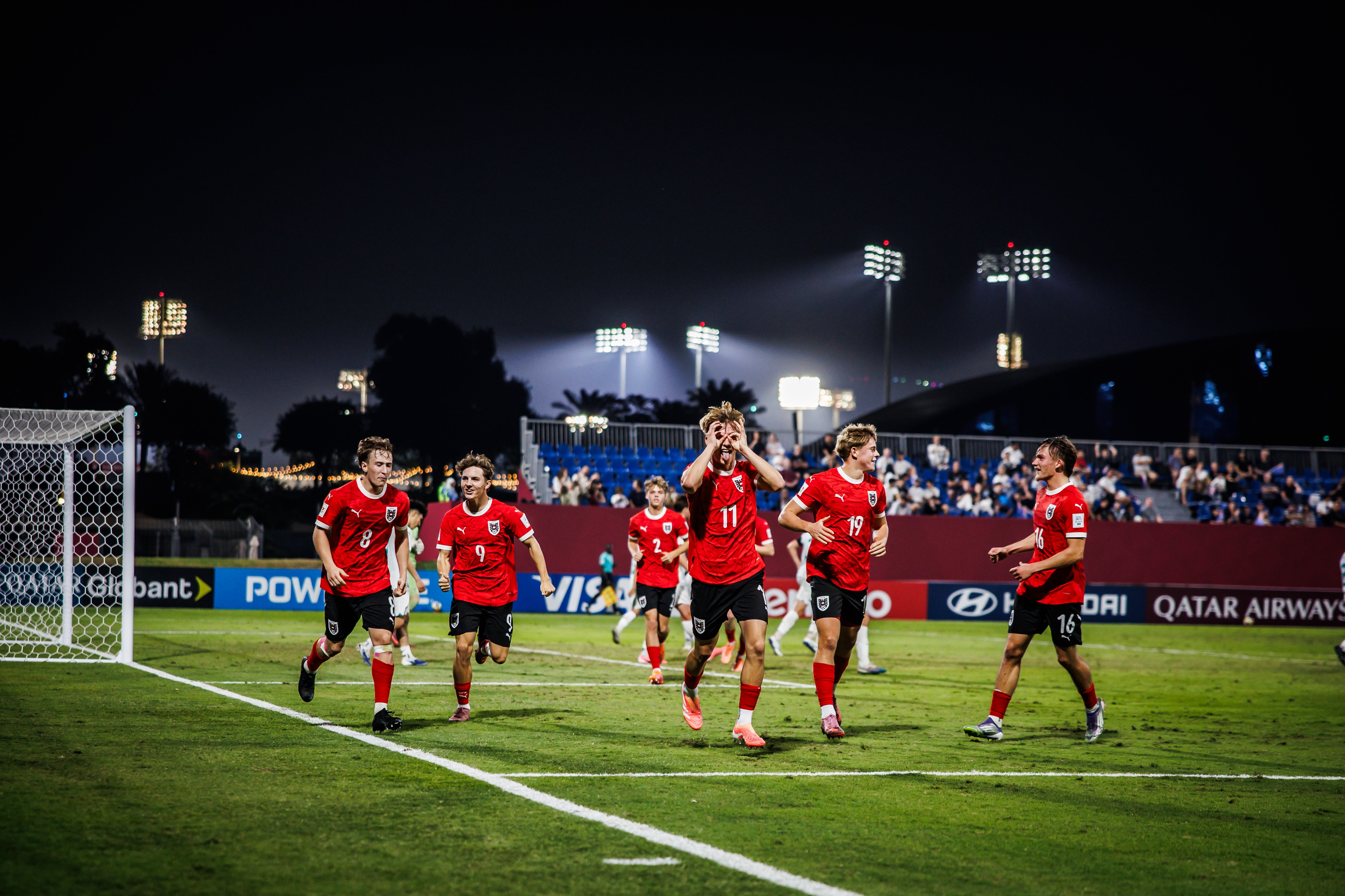 Gegen Neuseeland gab es am Dienstag in Doha in Pool L einen 4:1 (0:0)-Sieg. Die ÖFB-Tore erzielten Nicolas Jozepovic (49.), Dominik Dobis (87.) und zweimal Hasan Deshishku (88., 94.+4). Für den Gegentreffer sorgte William Britton (82.). Als ex aequo zweitbester Gruppensieger geht es im Sechzehntelfinale gegen den Gruppe-D-Dritten Tunesien.