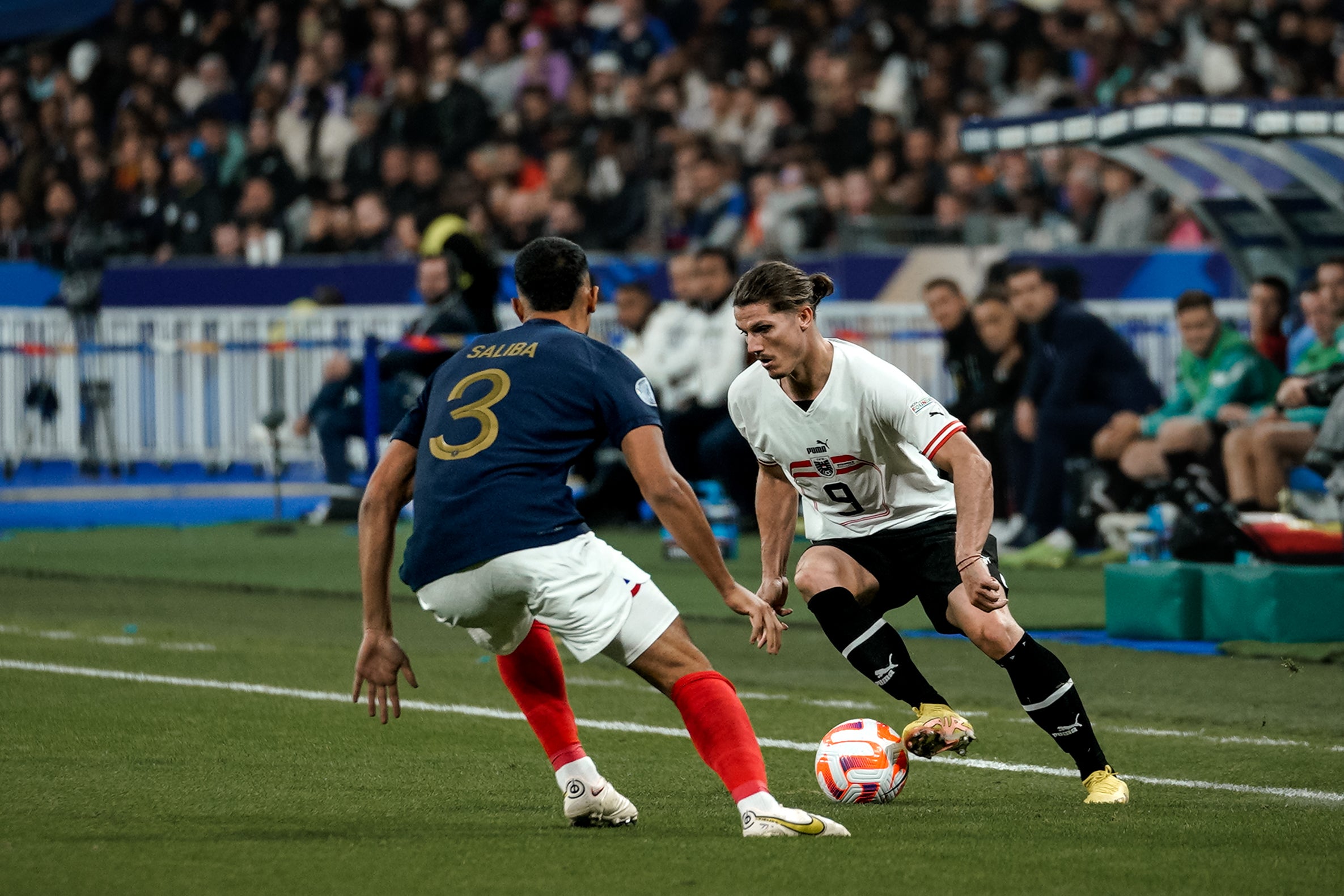 Im Gegensatz zum 1:1 im Juni in Wien fand Österreich vor der Pause nur selten den Ball, Pressing- und Konterchancen eröffneten sich kaum. Die meisten endeten vorzeitig, einmal kam Sabitzer nach energischer wie überlegter Vorarbeit von Xaver Schlager zum Schuss - verfehlte aus der Distanz aber (24.). Bester Mann war mit Abstand Goalie Patrick Pentz, der vor allem in der 35. Minute glänzte: Erst lenkte er einen Fallrückzieher von Aurelien Tchouameni an die Latte und war beim ebenso beim Nachschuss Antoine Griezmanns aus Kurzdistanz zur Stelle.