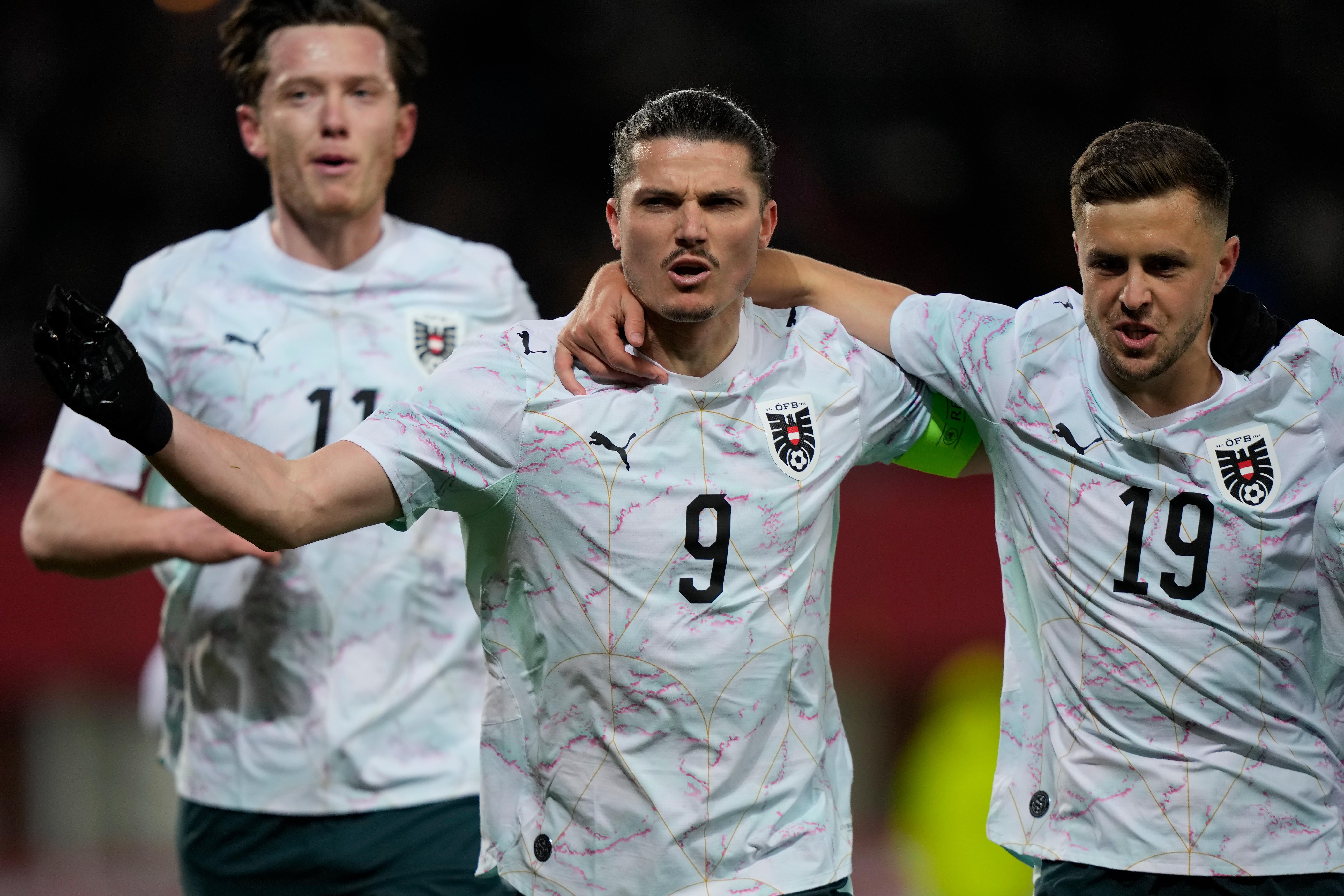 Österreich: Pentz (Bröndby IF/17 Länderspiele) - Posch (FSV Mainz/50/5 Tore), Lienhart (SC Freiburg/39/3), Danso (Tottenham/31/0), Prass (TSG Hoffenheim/17/0) - Laimer (Bayern München/55/7), X. Schlager (RB Leipzig/49/4) - Wimmer (VfL Wolfsburg/29/1), Baumgartner (RB Leipzig/57/19), Sabitzer (Borussia Dortmund/96/24) - Arnautovic (Roter Stern Belgrad/131/47)