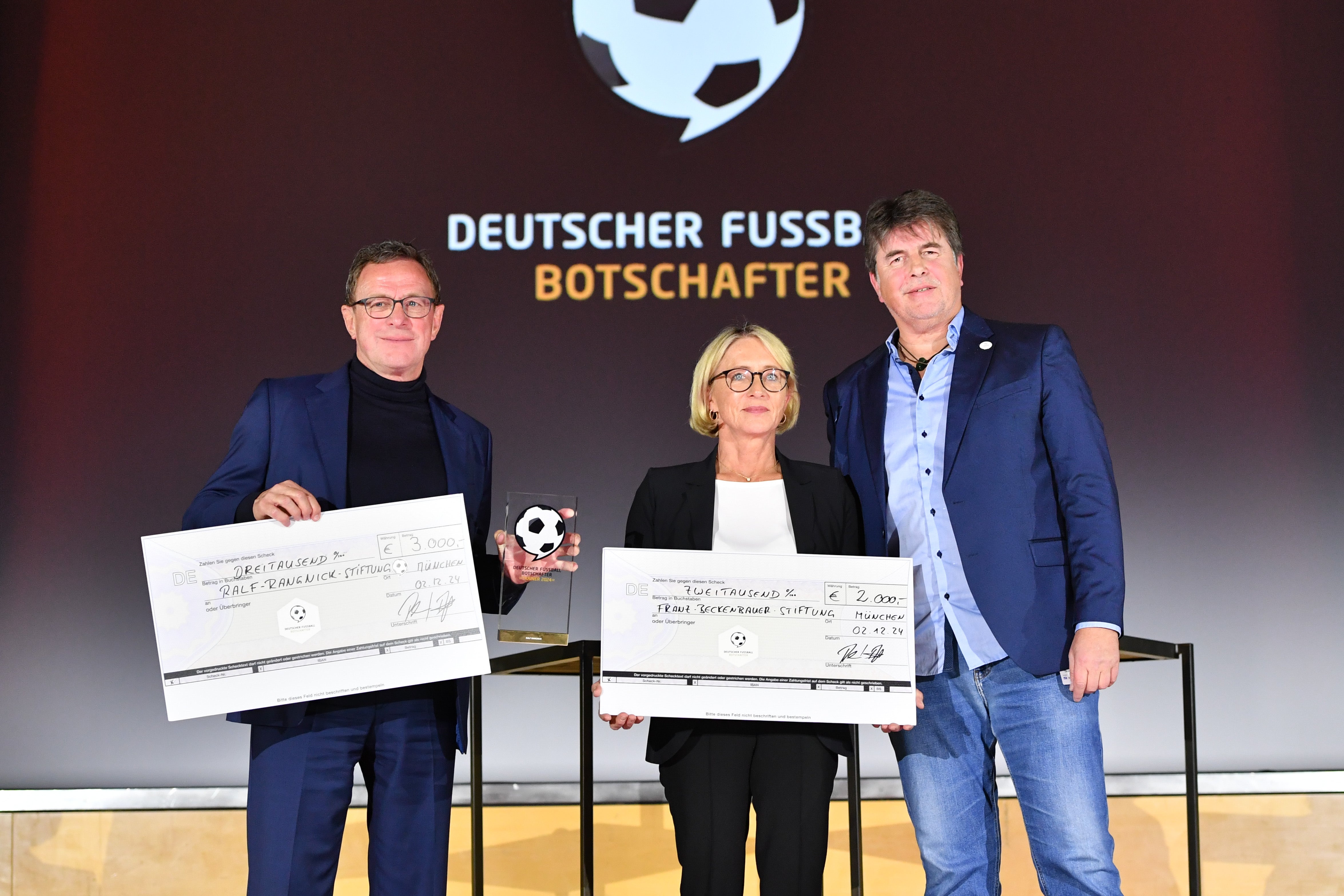 Den Ehrenpreis des 2012 gegründeten Vereins «Deutsche Fußball Botschafter» erhielten Lothar Matthäus und sein verstorbene Weltmeister-Kollege Andreas Brehme. Das Preisgeld dafür wurde an die Stiftung von Franz Beckenbauer gespendet. Dessen Witwe Heidi Beckenbauer nahm es am Montagabend auf derselben Bühne wie Rangnick in Empfang.