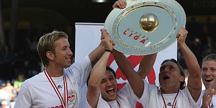 Die Fußball-Bundesliga hat für den Fall vorgesorgt, dass Red Bull Salzburg schon am Sonntag im Schlager zu Hause gegen Verfolger FK Austria Wien den nötigen Punkt zur erfolgreichen Titelverteidigung einfährt. Präsident Hans Rinner und Vorstand Georg Pangl werden in der 35. Runde als Zuschauer mit dem Meisterteller im Gepäck auf der Tribüne Platz nehmen. Gelingt den "Bullen" der nötige Punkt, wird die Trophäe anschließend überreicht.