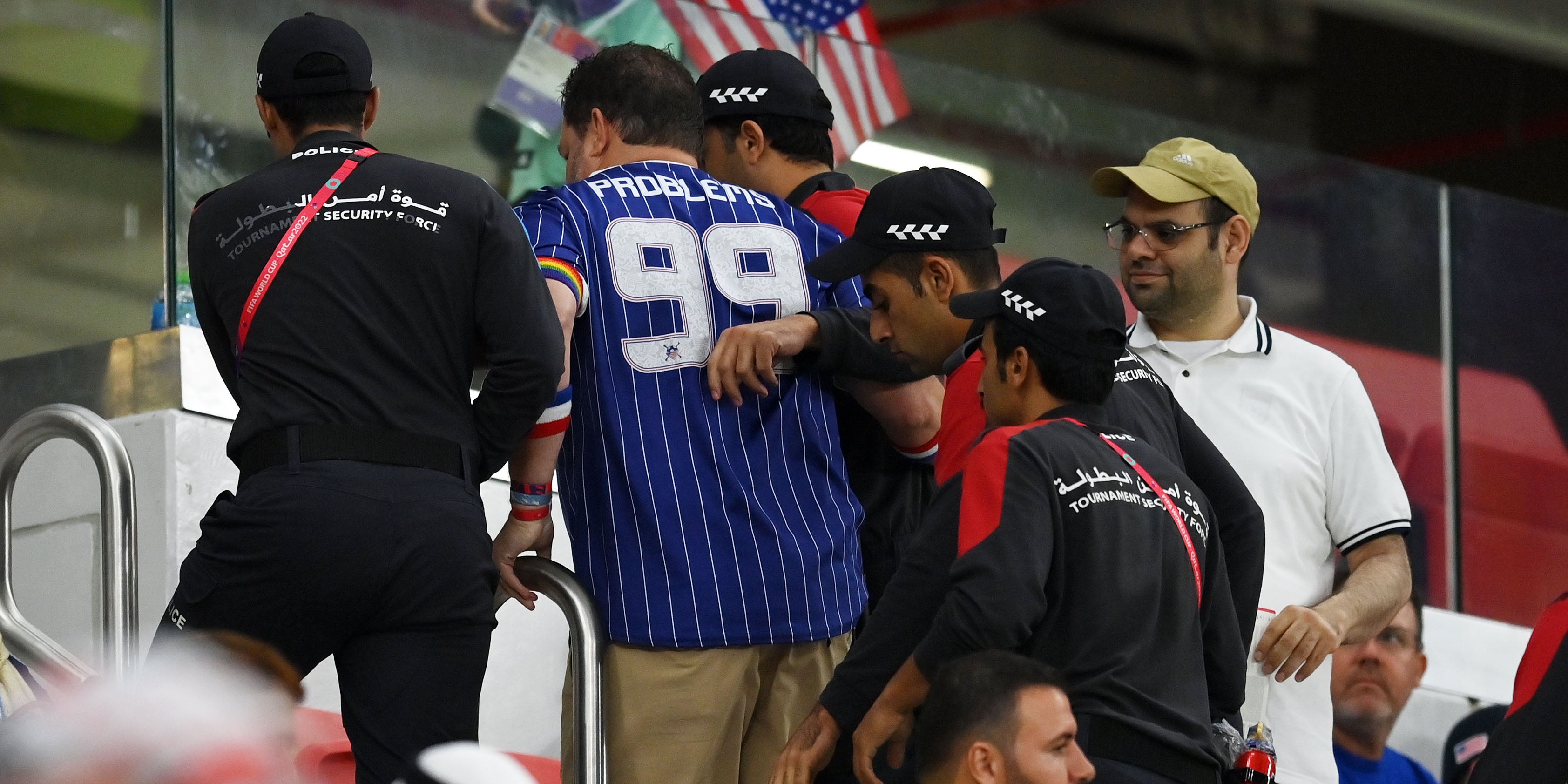 Schon wieder sorgt eine bunte Kapitänsbinde für einen Aufreger in Katar! Ein Fan der USA trägt auf seinem linken Oberarm eine Regenbogen-Binde und wird von der Polizei abgeführt.