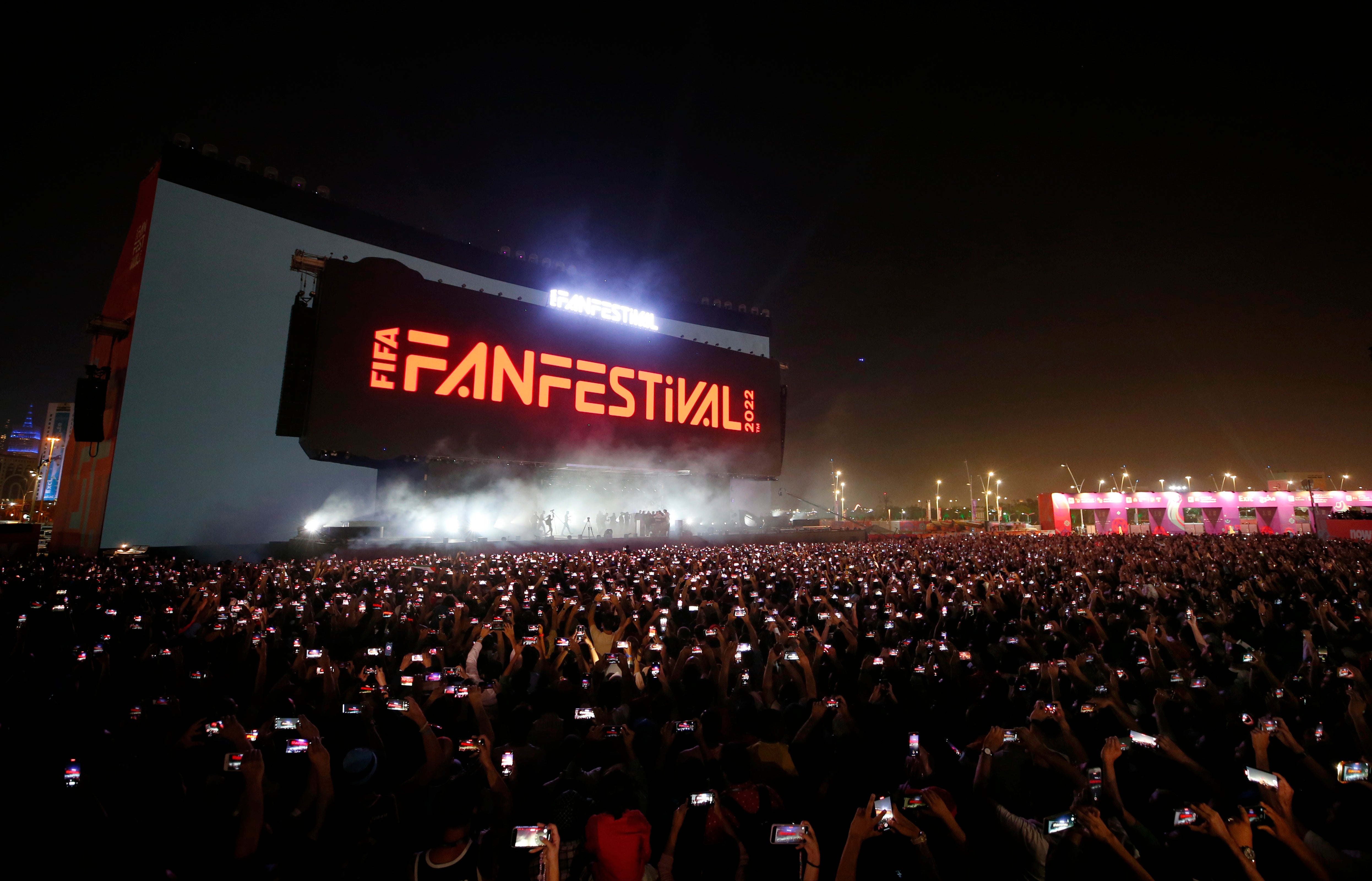 Das Gelände bietet Platz für 40.000 Menschen, auf Großbildleinwänden werden während der ersten WM in einem arabischen Land die Spiele gezeigt.