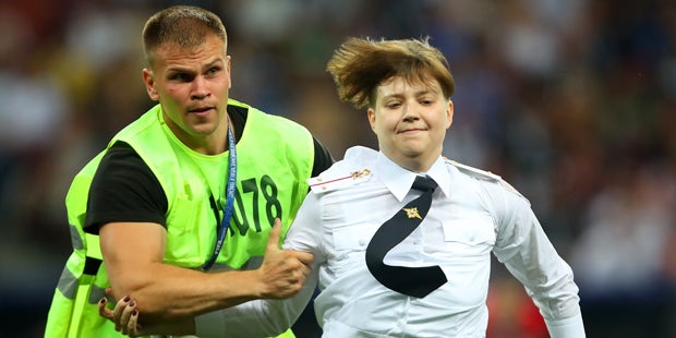 In großen Fußballspielen hat es fast schon Tradition. Meist junge Männer wollen Aufmerksamkeit und stürmen das Spielfeld. Mit Ordnern liefern sie sich ein Wettrennen und versuchen so lange wie möglich den Sicherheitskräften auszuweichen. So auch im WM-Finale in Moskau.