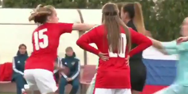 Beim EM-Qualifikationsspiel der U-17-Frauen zwischen der Schweiz und Russland kommt es zu einer wilden Prügelei. Nach einem Foul reißt die Russin Zhoze-Diana Pamen Tchato der Schweizerin Ella Ljustina plötzlich den Ball aus der Hand. Die zeigt sich angriffslustig, versetzt ihrer Gegnerin einen Tritt von hinten ins Gesäß.