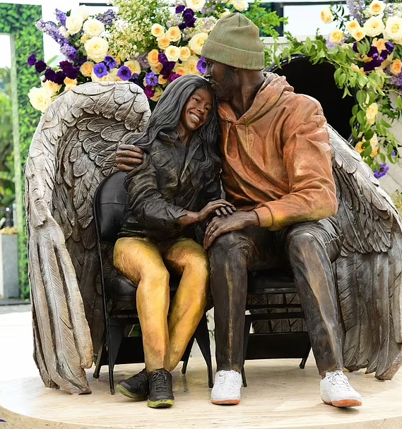 Das Kunstwerk befindet sich in einer neuen Gartenlandschaft am Eingang zur 11th Street und wurde vom Rotblatt Amrany Studio geschaffen. Es zeigt Kobe, wie er seinen Arm um Gigi legt und ihr einen Kuss auf den Kopf drückt.