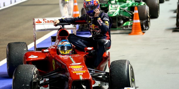 Sündhaft teure Taxi-Fahrt? Nein, nur ein Scherz von Ferrari. Nach der Formel-1-Mitfahrgelegenheit von Singapur schickte die Scuderia der "Bild" zufolge eine Rechnung über umgerechnet etwas mehr als 20.000 Euro an Mark Webber - inklusive Nachtzuschlag und Trinkgeld. Der Red-Bull-Pilot hatte sich nach dem Aus am Sonntag von Fernando Alonso zurück an die Box fahren lassen.