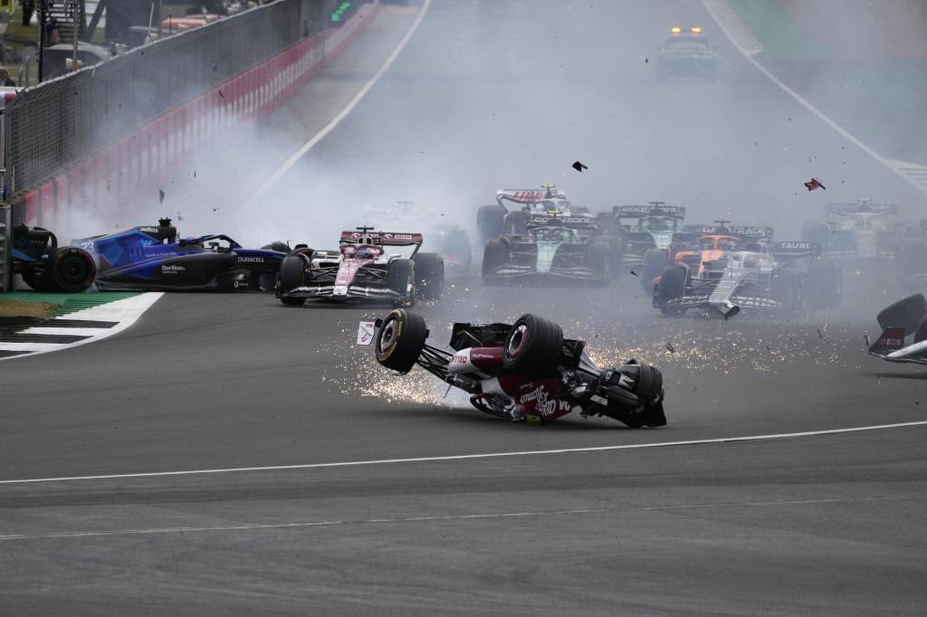 Der Formel-1-Grand-Prix von Großbritannien in Silverstone ist am Sonntag wenige Sekunden nach dem Start mittels roter Flaggen abgebrochen worden. Davor war es zu einem heftigen Crash gekommen. Der Chinese Zhou Guanyu überschlug sich in seinem Alfa Romeo und wurde mit hoher Geschwindigkeit über einen Reifenstapel in einen Zaun geschleudert.