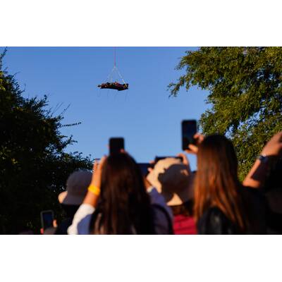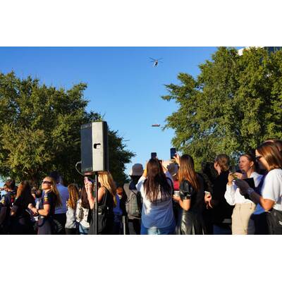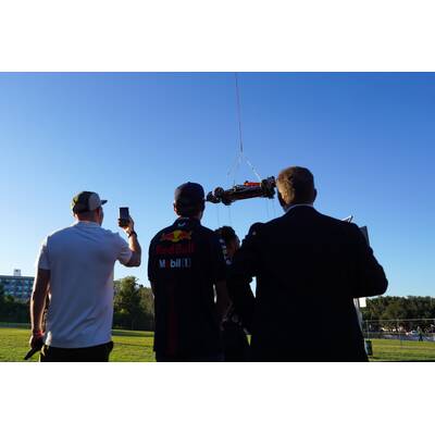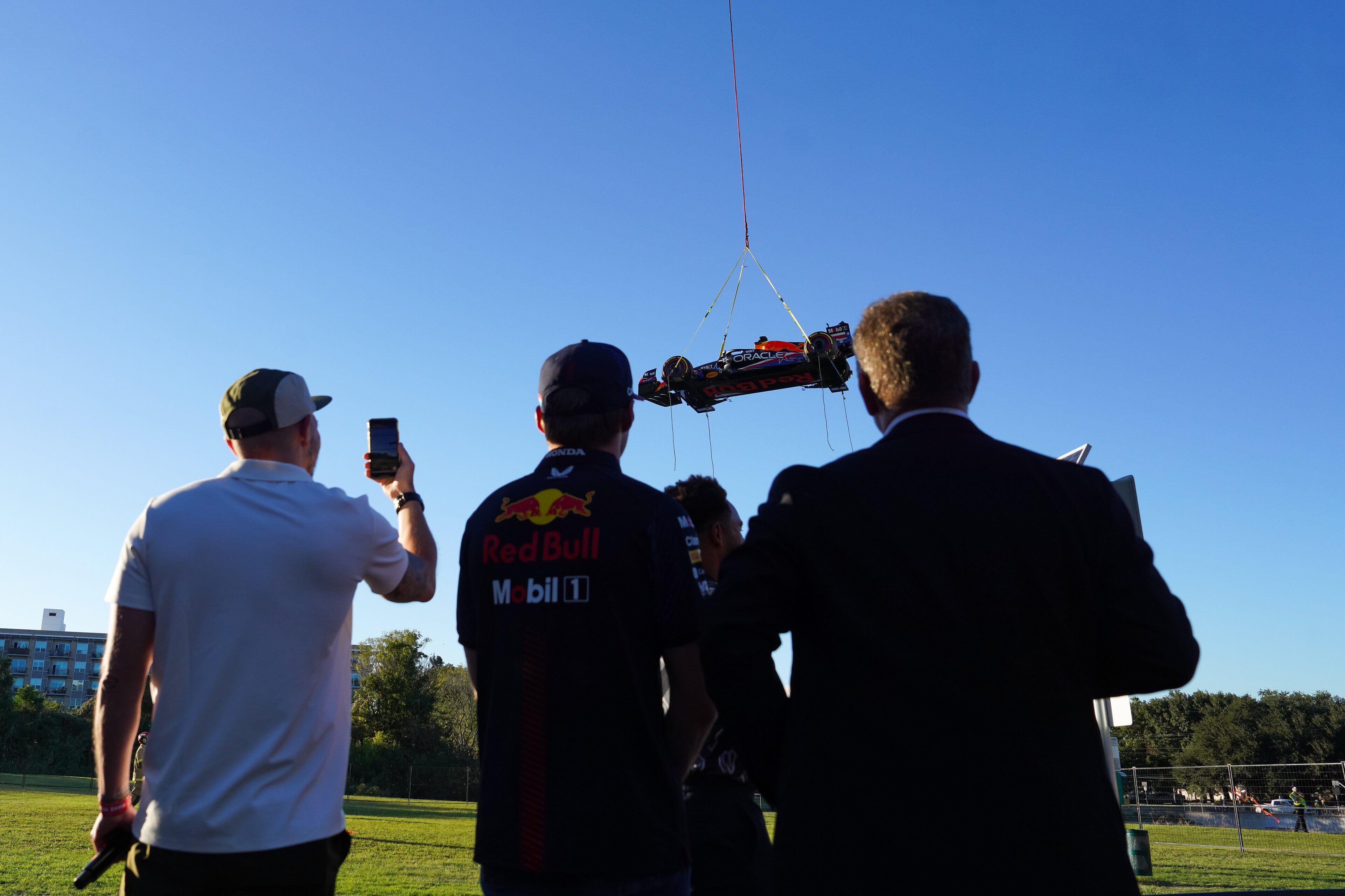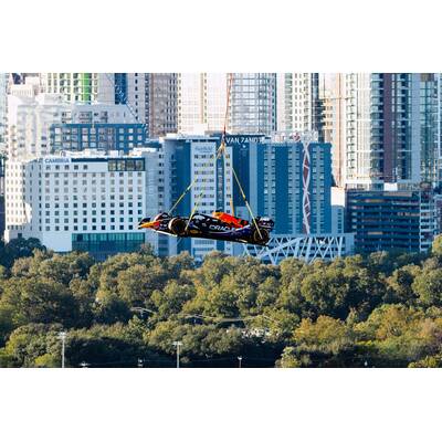 Menschentrauben, Handy-Fotos, allen blieb allen der Mund offen: Passend zum Anlass ließ Red Bull am Medien-Donnerstag Verstappens Boliden per Helikopter über den Dächern von Austin einschweben.