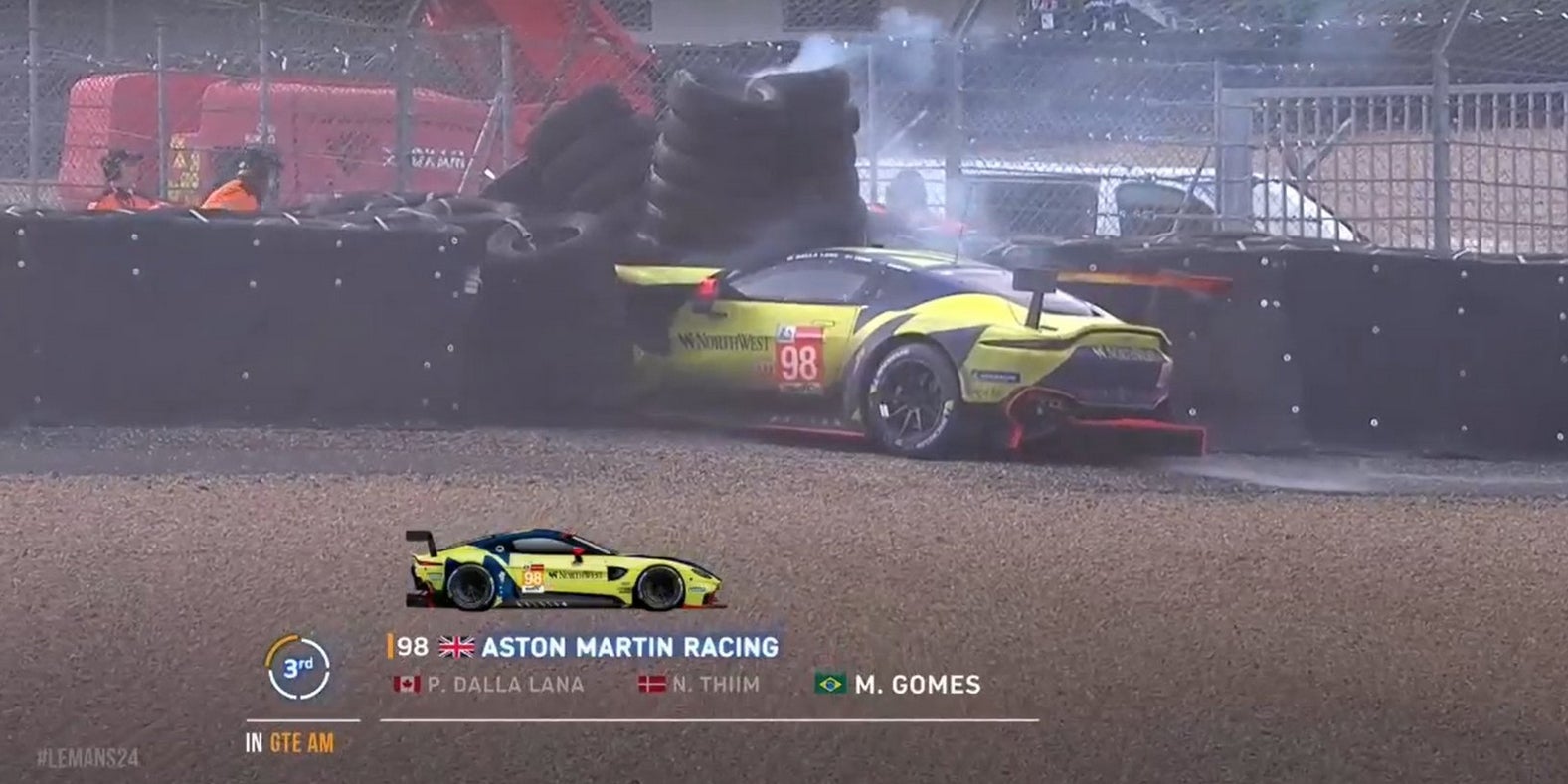 Der Motosport-Klassiker in Le Mans bleibt nicht von Unfällen verschont. Beim 24h-Rennen verlor Pilot Marcos Gomes die Kontrolle über seinen Aston Martin Vantage AMR, rutschte über das Kiesbett und krachte schließlich in einen Reifenstapel.