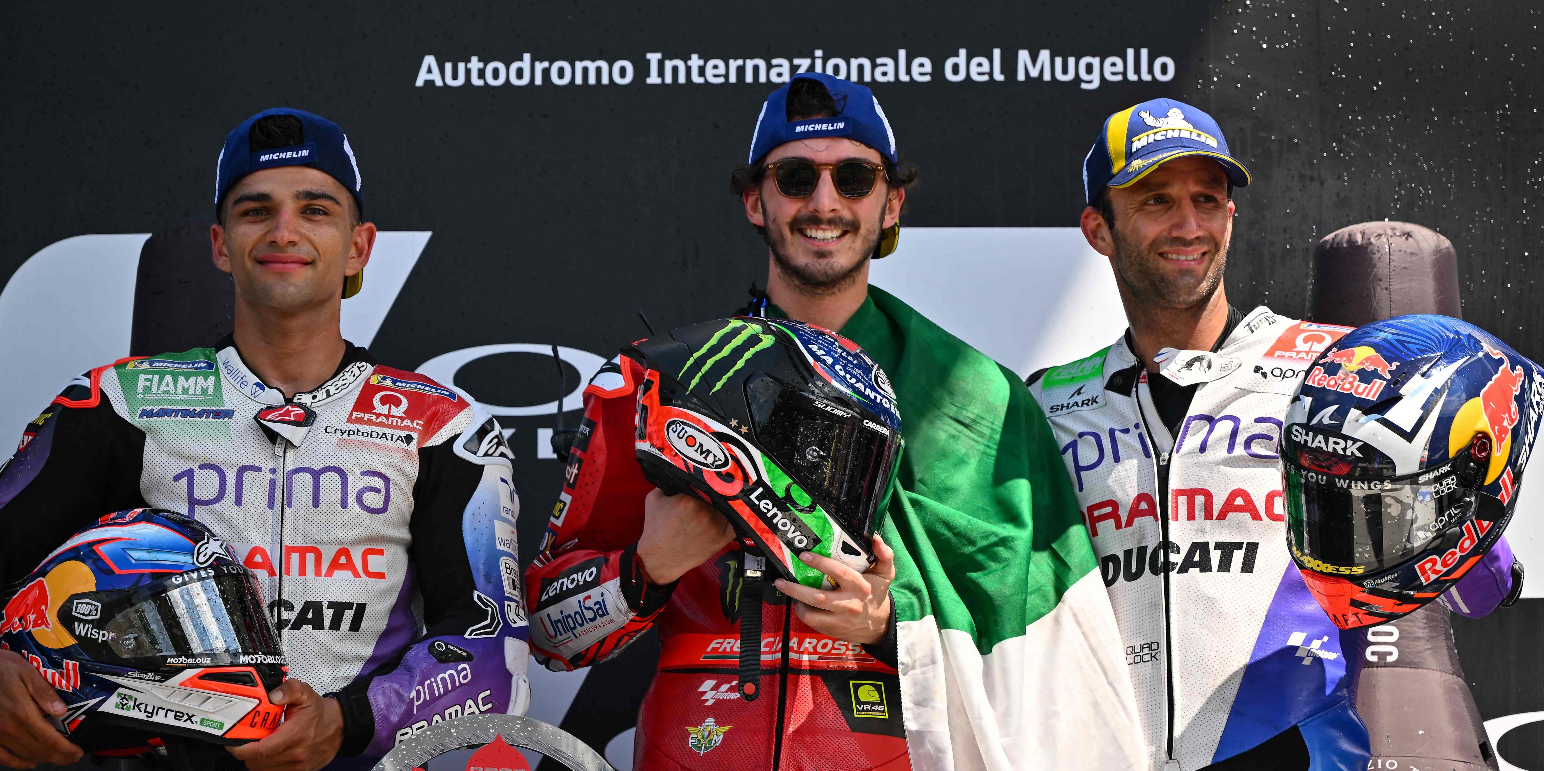 Der Ducati-Pilot, der schon im Sprintrennen tags zuvor gesiegt hatte, triumphierte in der Toskana vor seinen Markenkollegen Jorge Martin (ESP) und Johann Zarco (FRA) und holte damit seinen dritten Saisonsieg. In der Gesamtwertung führt Bagnaia nun 21 Punkte vor seinem ersten Verfolger Marco Bezzecchi, der Achter wurde.