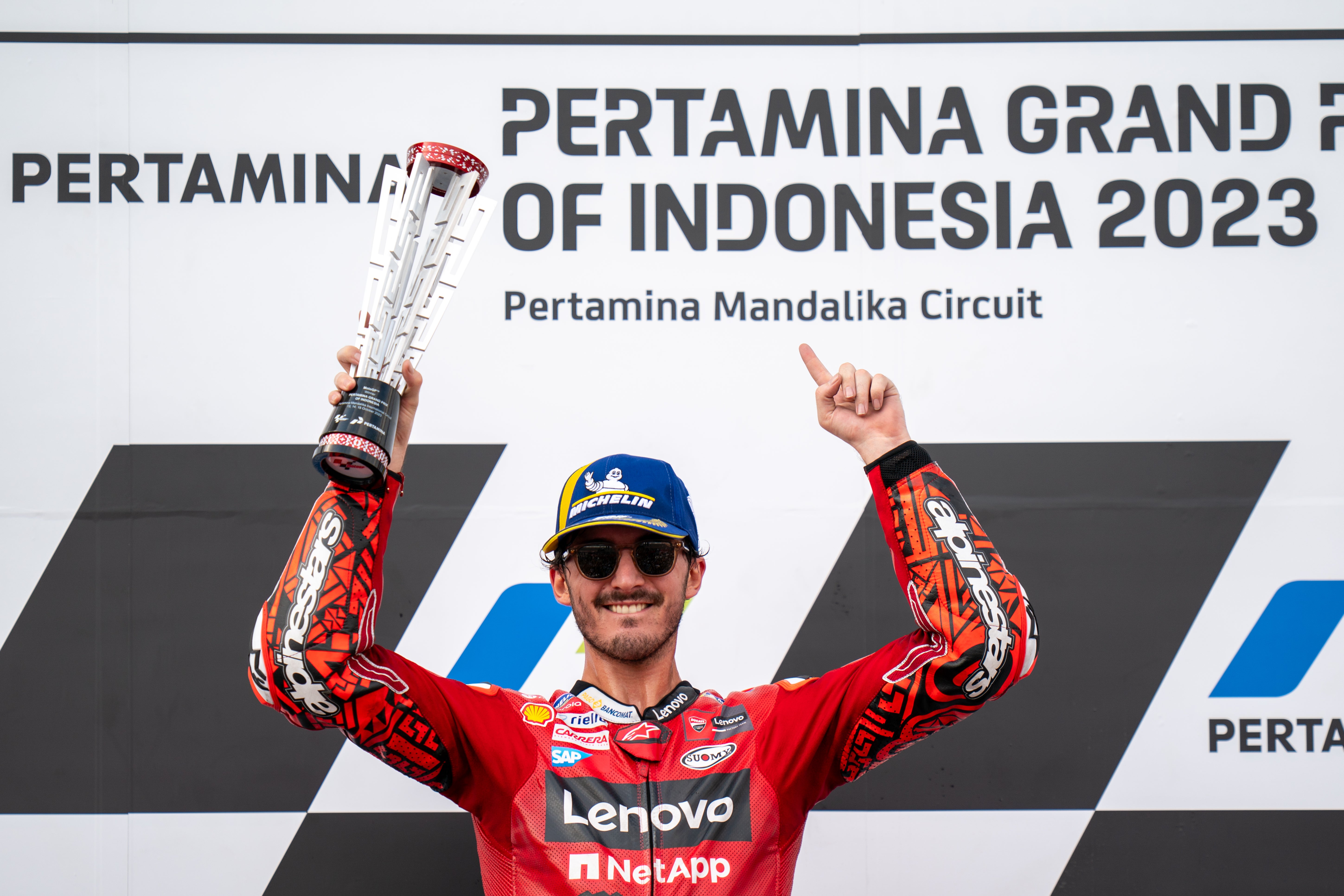 Der italienische Ducati-Pilot war am Sonntag in Mandalika die große Figur: Von Startplatz 13 aus ins Rennen gegangen, startete er eine beeindruckende Aufholjagd und setzte sich sieben Runden vor Schluss an die Spitze. Er ließ sich die Führung nicht mehr nehmen und verwies Maverick Viñales auf Aprilia und Yamaha-Pilot Fabio Quartararo auf die Plätze.