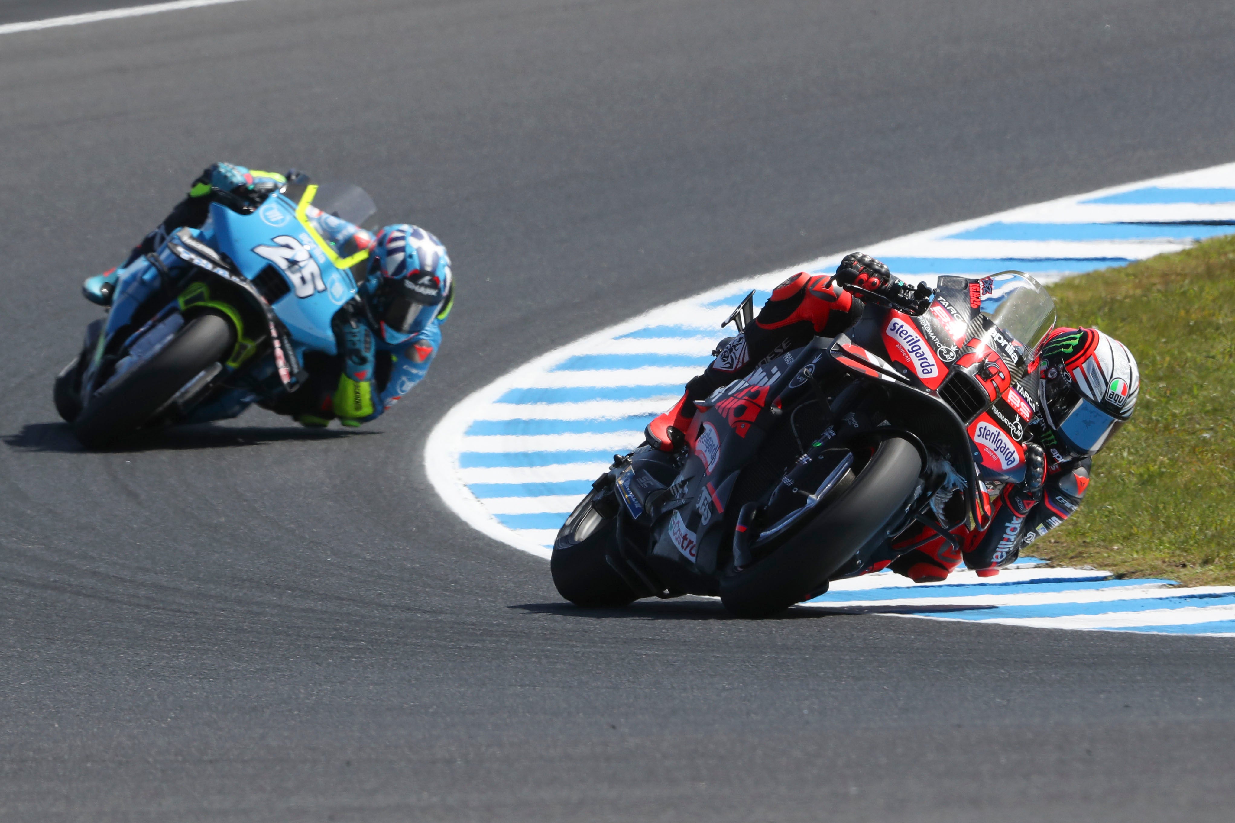 Der Aprilia-Pilot setzte sich trotz kleinerer Fehler und einer Kollision mit einer Möwe auf der Aufwärmrunde vor den Spaniern Raul Fernandez (Aprilia-Trackhouse) und KTM-Pilot Pedro Acosta durch. Pol Espargaro (KTM Tech 3) holte als Neunter den letzten Punkt.