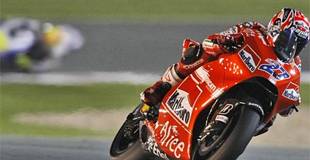 Der Australier Casey Stoner hat am Ostermontag das Auftakt-Rennen der MotoGP-Saison beim Motorrad-WM-Lauf von Katar in Doha gewonnen. Der Ducati-Pilot verwies bei seinem dritten Erfolg in Serie in der Wüste Titelverteidiger Valentino Rossi aus Italien und dessen Yamaha-Teamkollegen Jorge Lorenzo aus Spanien auf die Plätze. Es war ein Start-Ziel-Sieg des Australiers, der von der Pole Position aus ins Rennen gegangen war und 7,7 Sekunden Vorsprung herausfuhr. Das Rennen war nachgeholt worden, weil am Ostersonntag wegen eines Wolkenbruchs nicht gestartet werden konnte.