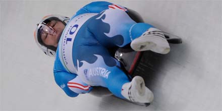 schlitterte die Bahn entlang, kam aber wieder auf seine Rodel zu sitzen und