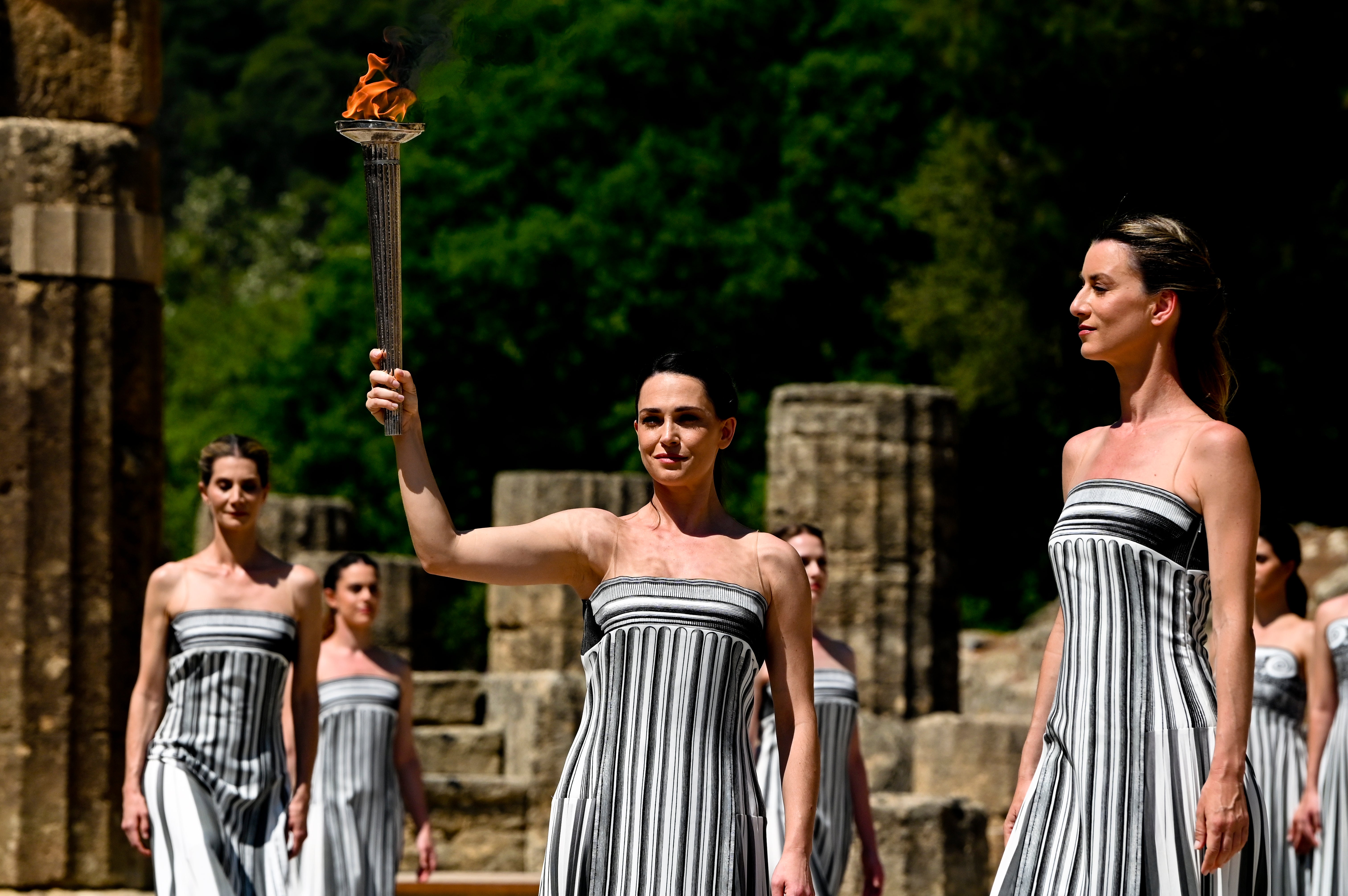 Traditionell wird das olympische Feuer mithilfe eines Parabolspiegels entfacht. Das fiel am Dienstag aus. "Apollon, Gott der Sonne und des Lichtes, du hast deine Strahlen geschickt und die Fackel für die gastfreundliche Stadt von Paris angezündet", sagte die "Hohe Priesterin", die griechische Aktrice Mary Mina, bei der Zeremonie.