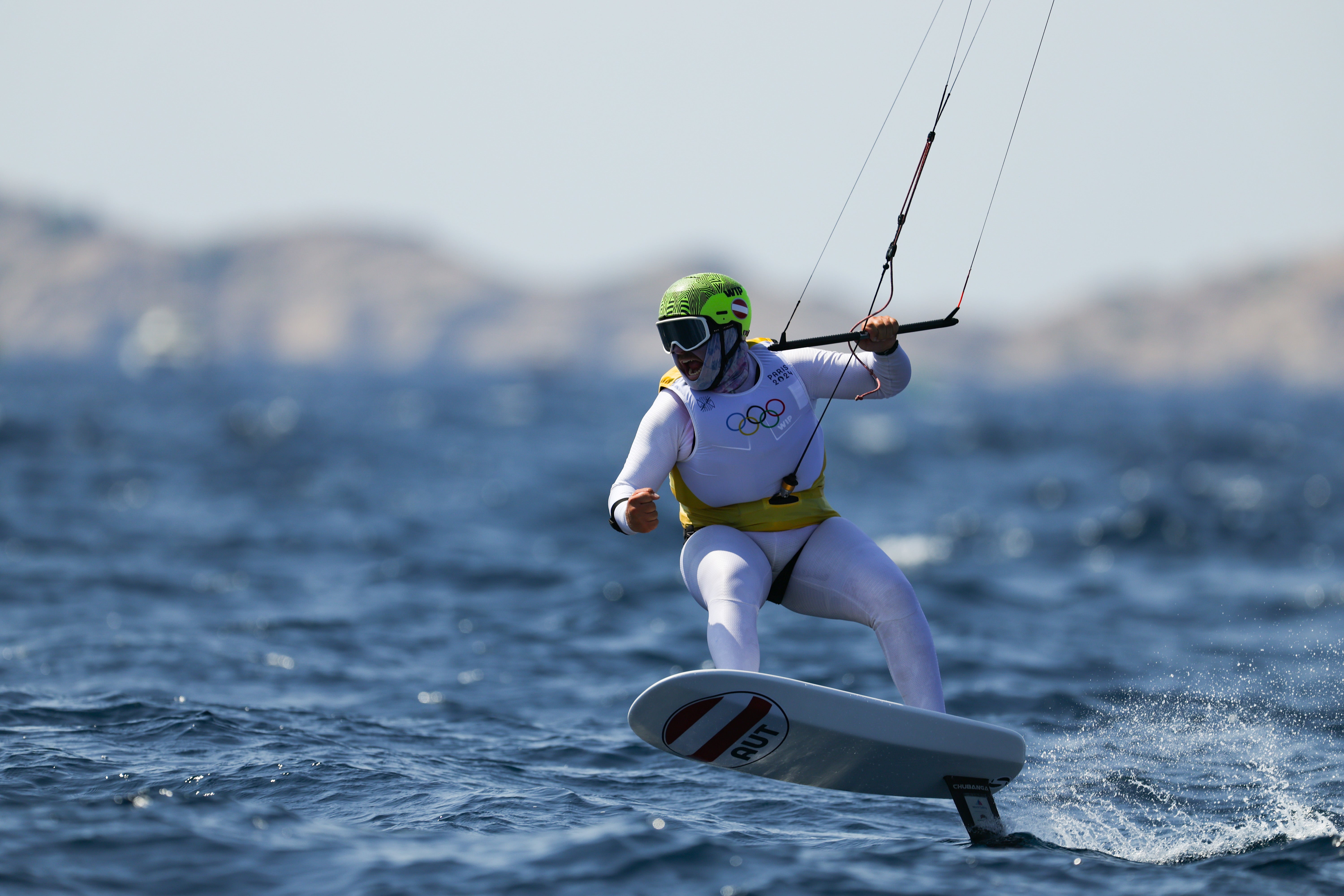 Kitesurfer Valentin Bontus (23) gewann die erste Final-Wettfahrt am Donnerstag vor Marseille und ist auf Medaillen-Kurs. Wegen Flaute fällt die Entscheidung am Freitag.