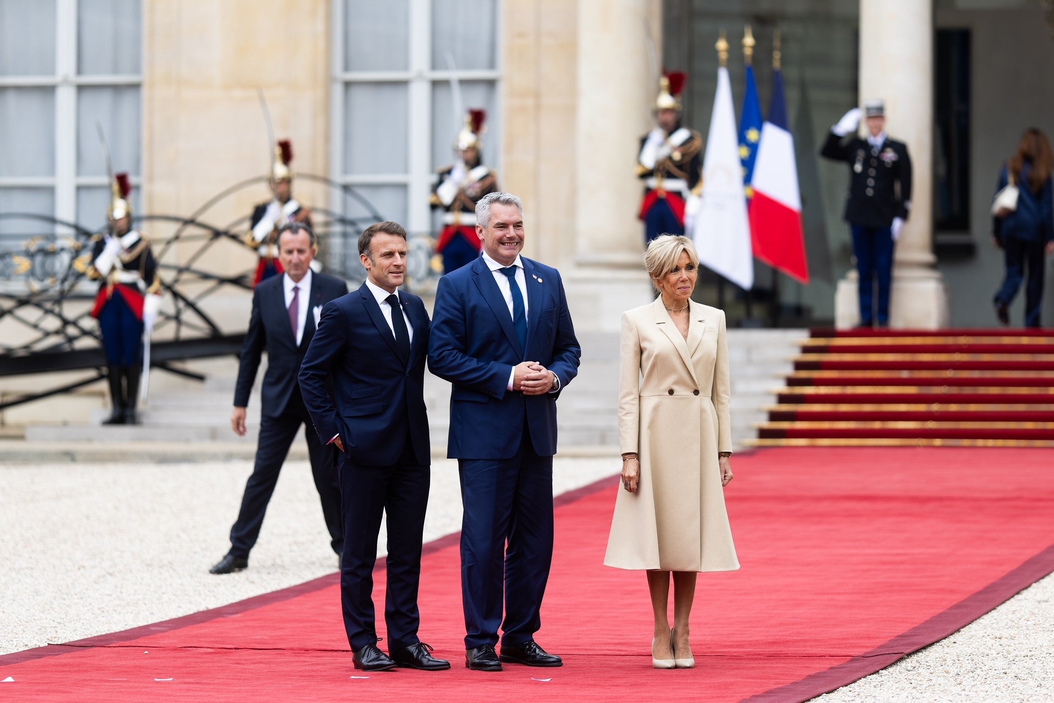 Macron und dessen Gattin haben den österreichischen Bundeskanzler auf dem Roten Teppich vor dem Élysée-Palast empfangen.
