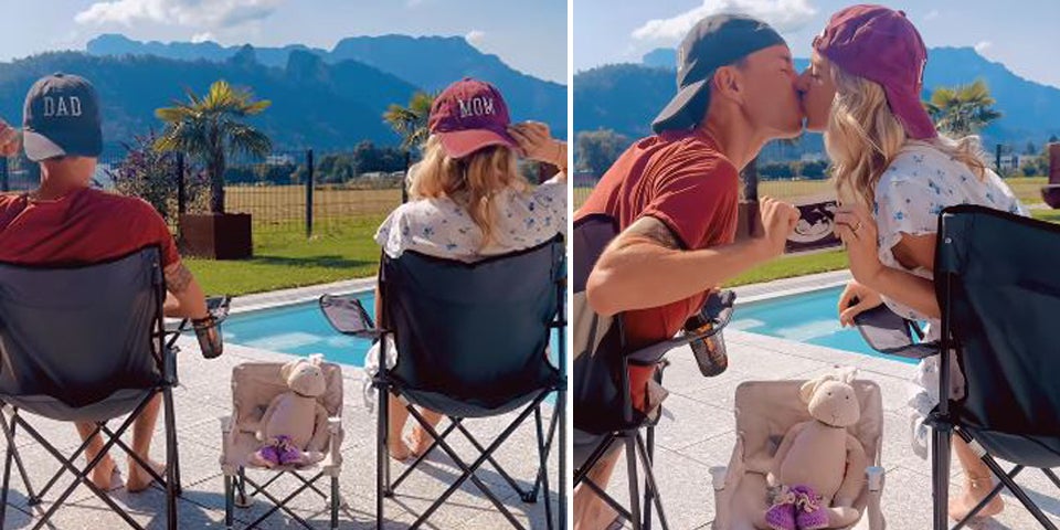 In dem herzerwärmenden Clip sitzen die werdenden Eltern am Pool vor den Barmsteinen, den Halleiner Hausbergen, dahinter ist der Untersberg zu sehen. Nach einem Anstoßen mit kühlen Getränken zeigt das Paar küssend das erste Ultraschallbild ihres Babys. Beide tragen dabei Kappen mit den Aufschriften "Mom" und "Dad".