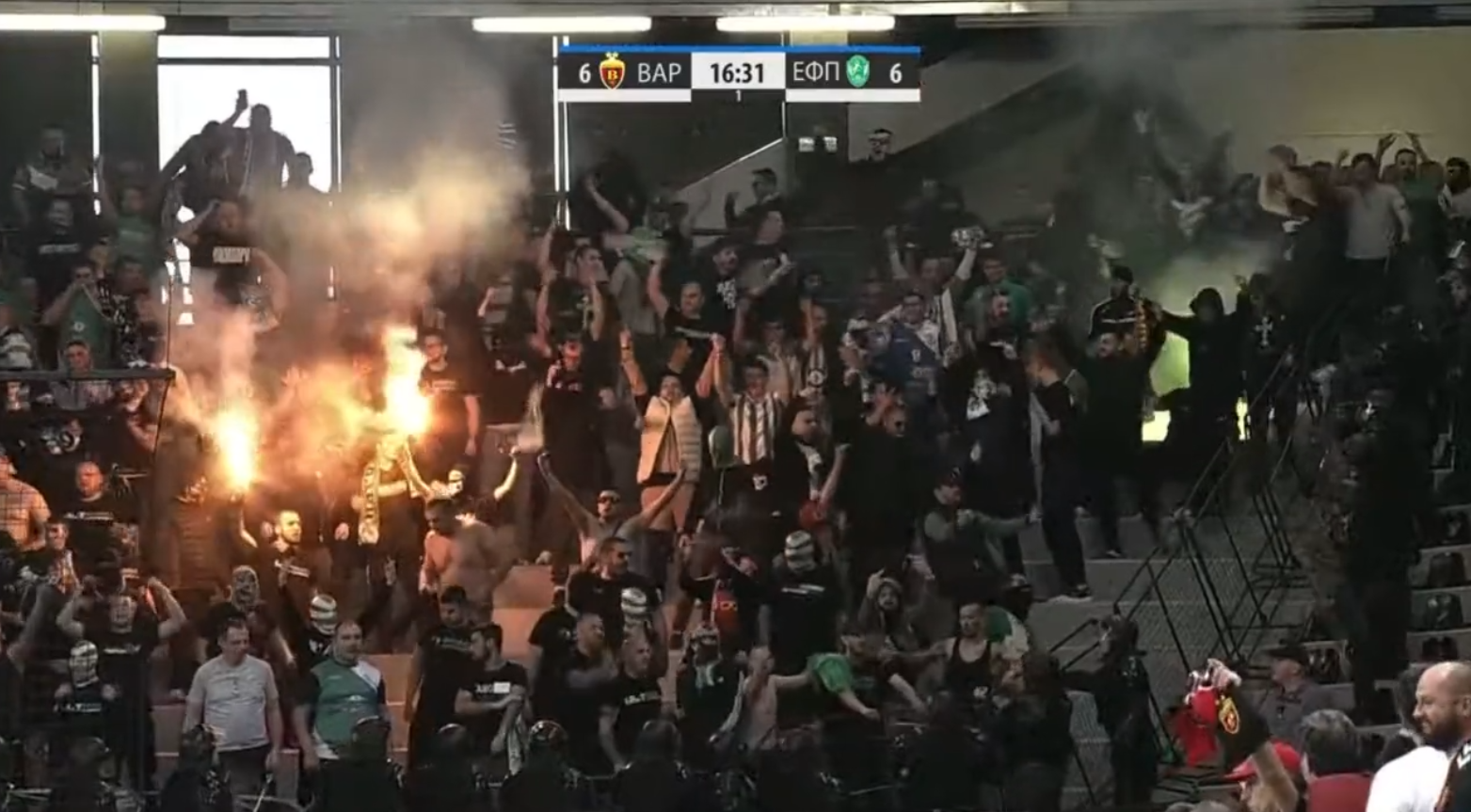 Nach 15 Minuten eskalierte dann die Situation völlig. Als die Fans von Eurofarm Pelister ins Stadion gelassen wurden, zündeten sie direkt Pyrotechnik und bewarfen den Gästeblock mit Gegenständen.