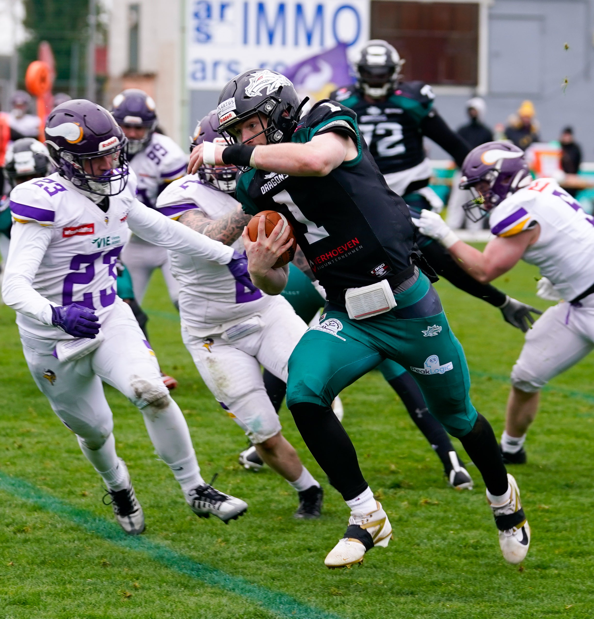 Auch der Vikings-Spielmacher erlebte einen wahren Kaltstart kurz vor Ende des ersten Viertels. Genauso wie sein Gegenüber verlor er tief in der eigenen Hälfte bei einem Laufversuch den Ball, den die Dragons aufnehmen konnten. Der Ballverlust wurde von den Hausherren auch bestraft. Kuhlenkamp führte sein Team über das Feld und konnte unter starker Bedrängnis mit einem Traumpass auf Moritz Dungler zu seinem ersten Touchdown den Ausgleich erzielen.