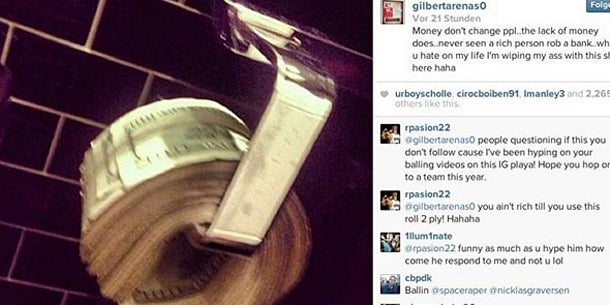 Der ehemalige Star der Washington Wizards postete nun ein Foto direkt aus seiner Toilette. Zu sehen: Eine Rolle 100-Dollar-Scheine statt einer Klopapier-Rolle. Dazu der Spruch: "Geld verändert die Menschen nicht, nur wenn man zu wenig davon hat. Ich habe noch nie einen Reichen gesehen, der eine Bank ausgeraubt hätte. Während ihr mich hasst, wische ich meinen Ar... mit diesem Schei... hier ab. Haha."