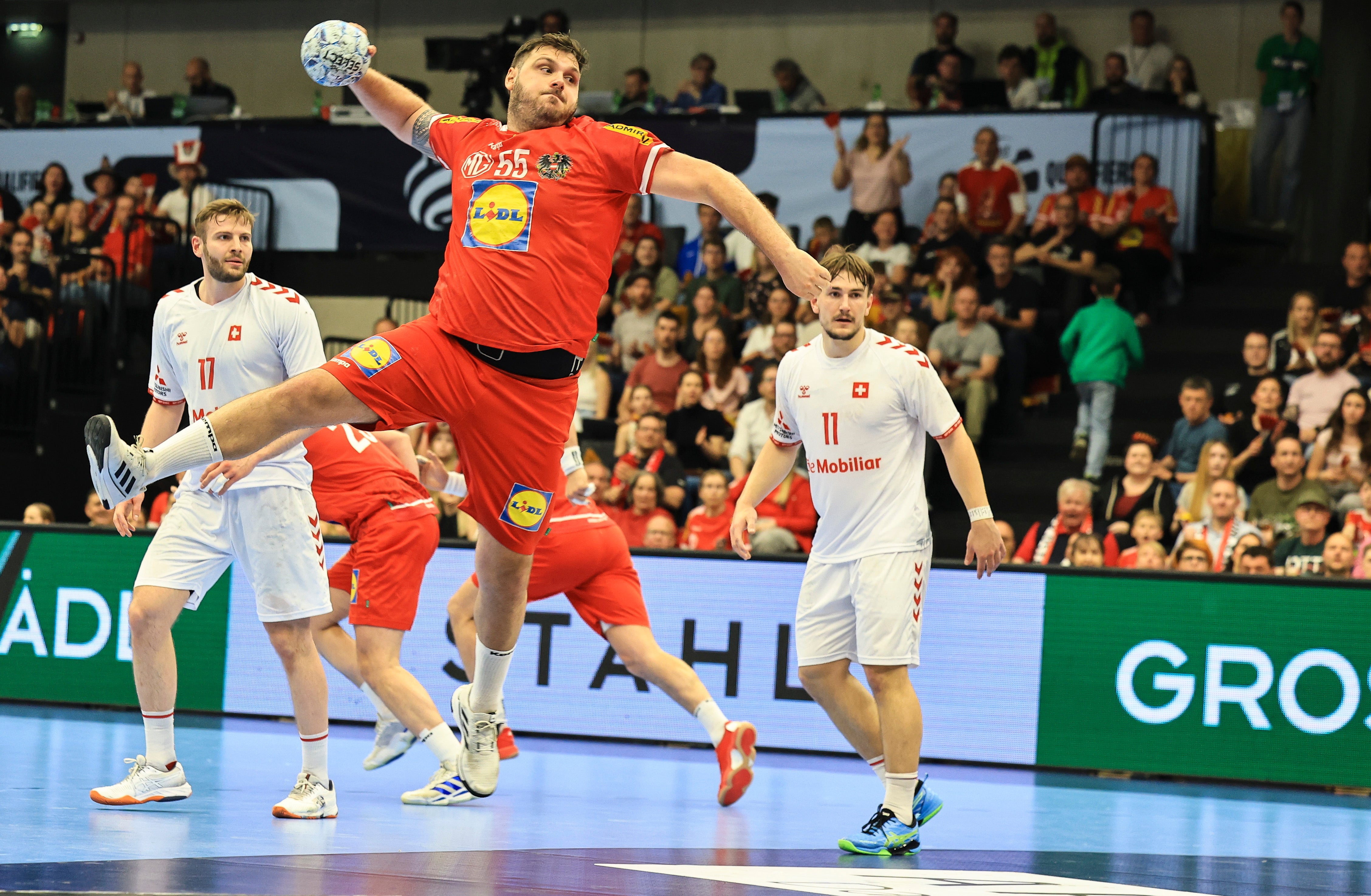 Österreich fand mit dem Heimpublikum im Rücken im vollen Sportpark gut in die Partie und führte nach fünf Minuten mit 4:1. Durch Zeitstrafen gegen Lukas Herburger und Janko Bozovic blieben die kampfstarken Schweizer im Spiel, das Team von Coach Andy Schmid schaffte bei 9:9 den Ausgleich. Angetrieben vom 39-jährigen Bozovic, der sichtlich in Wurflaune war, erarbeiteten sich die Gastgeber aber immer wieder einen Zwei-Tore-Vorsprung. In die Pause ging es mit 16:15.