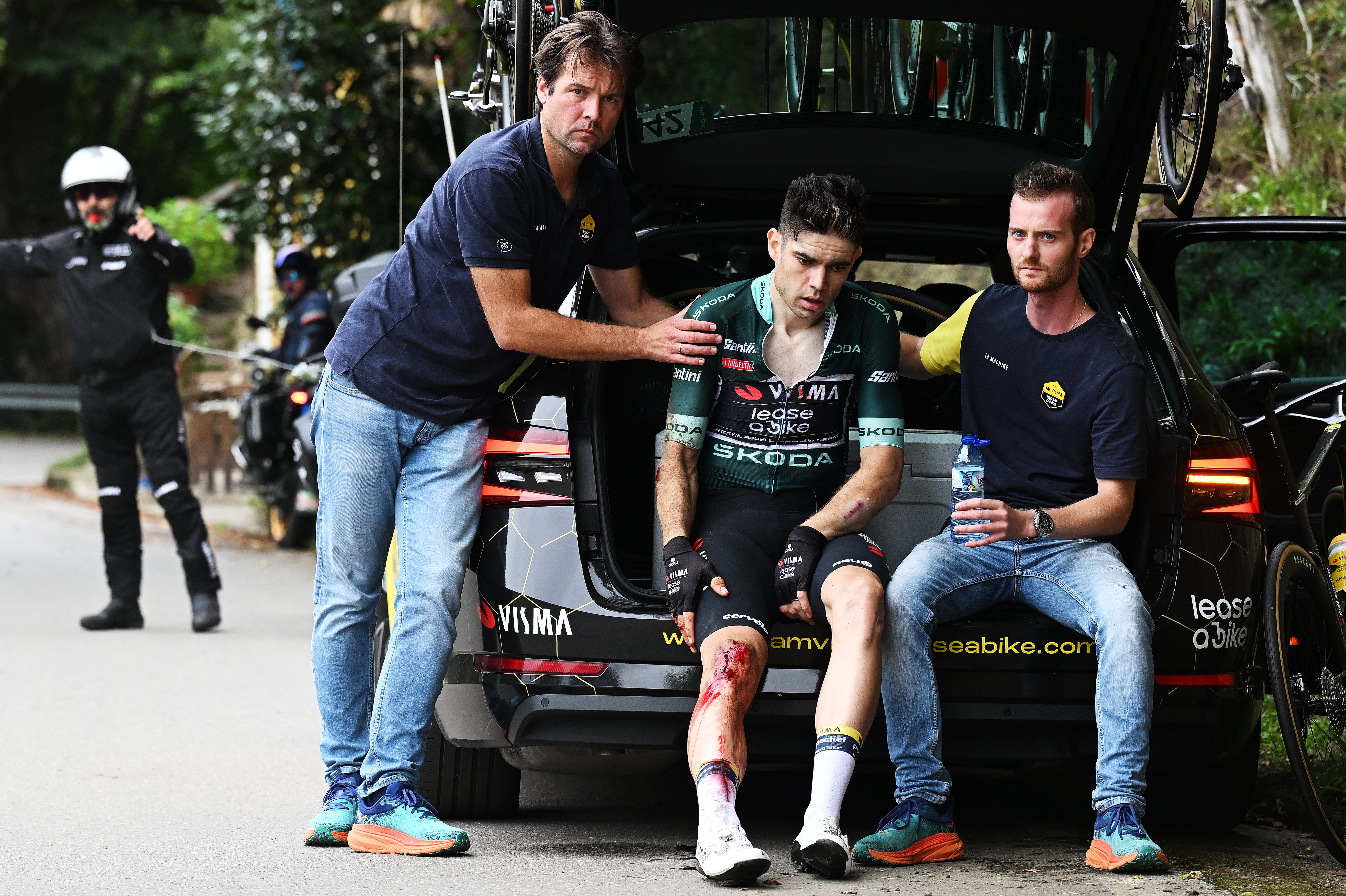 Ganz schlimm erwischte es einen Rad-Superstar: Der Olympia-Dritte im Zeitfahren Wout van Aert stürzte auf der schwierigen Dienstag-Etappe bereits in der Anfangsphase. Er kämpfte sich zurück und übernahm sogar die Führung. Doch auf der Abfahrt vom Collada Llomena kam es auf der regennassen Bergstraße zum Horrorcrash, in den Van Aert (Visma) abermals verwickelt war: Der Belgier rutschte wie seine Flucht-Kollegen Felix Engelhardt (GER/Jayco-AlUla) und Isaac del Toro (MEX/UAE Team Emirates) in einer Kurve aus, alle drei krachten in eine Steinwand.