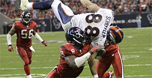 Die Houston Texans haben ihre kleinen Hoffnungen, erstmals in der Clubgeschichte das NFL-Play-off zu erreichen, am Donnerstag am Leben erhalten. Die Texaner verbesserten ihre Saisonbilanz mit einem 31:13-Heimerfolg gegen die Denver Broncos auf 7:7 Siege. Houstons Ersatz-Quarterback Sage Rosenfels erlief selbst einen Touchdown und warf einen weiteren.