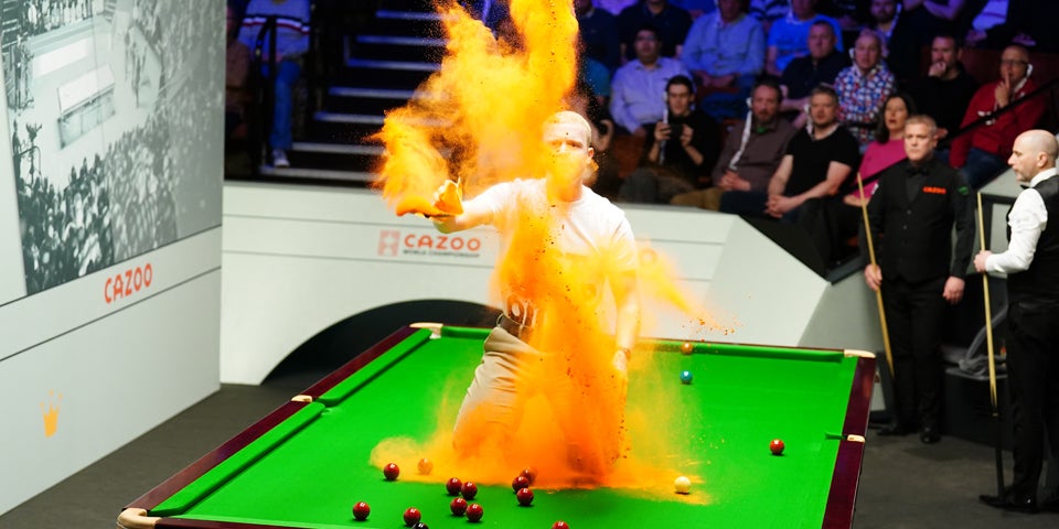 ???? At around 7:20pm, two Just Stop Oil supporters have disrupted the World Snooker Championship at the Crucible Theatre in Sheffield, interrupting play. The pair proceeded to cover the tables in orange powder paint before being removed by… pic.twitter.com/xWJXjW82jf