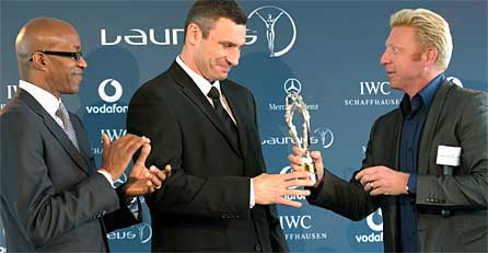 Der ukrainische Schwergewichts-Boxweltmeister Witali Klitschko ist am Freitag in Dortmund mit dem Laureus-Preis für das "Comeback des Jahres" ausgezeichnet worden. Der 37-Jährige erhielt die Auszeichnung von den Laureus-Akademie-Mitgliedern Boris Becker und Edwin Moses. "Das ist eine einzigartige Ehre und ein Höhepunkt meiner Karriere", sagte Klitschko, dessen jüngerer Bruder Wladimir am Samstag in Gelsenkirchen einen WM-Kampf gegen den Usbeken Ruslan Tschagajew bestreitet.