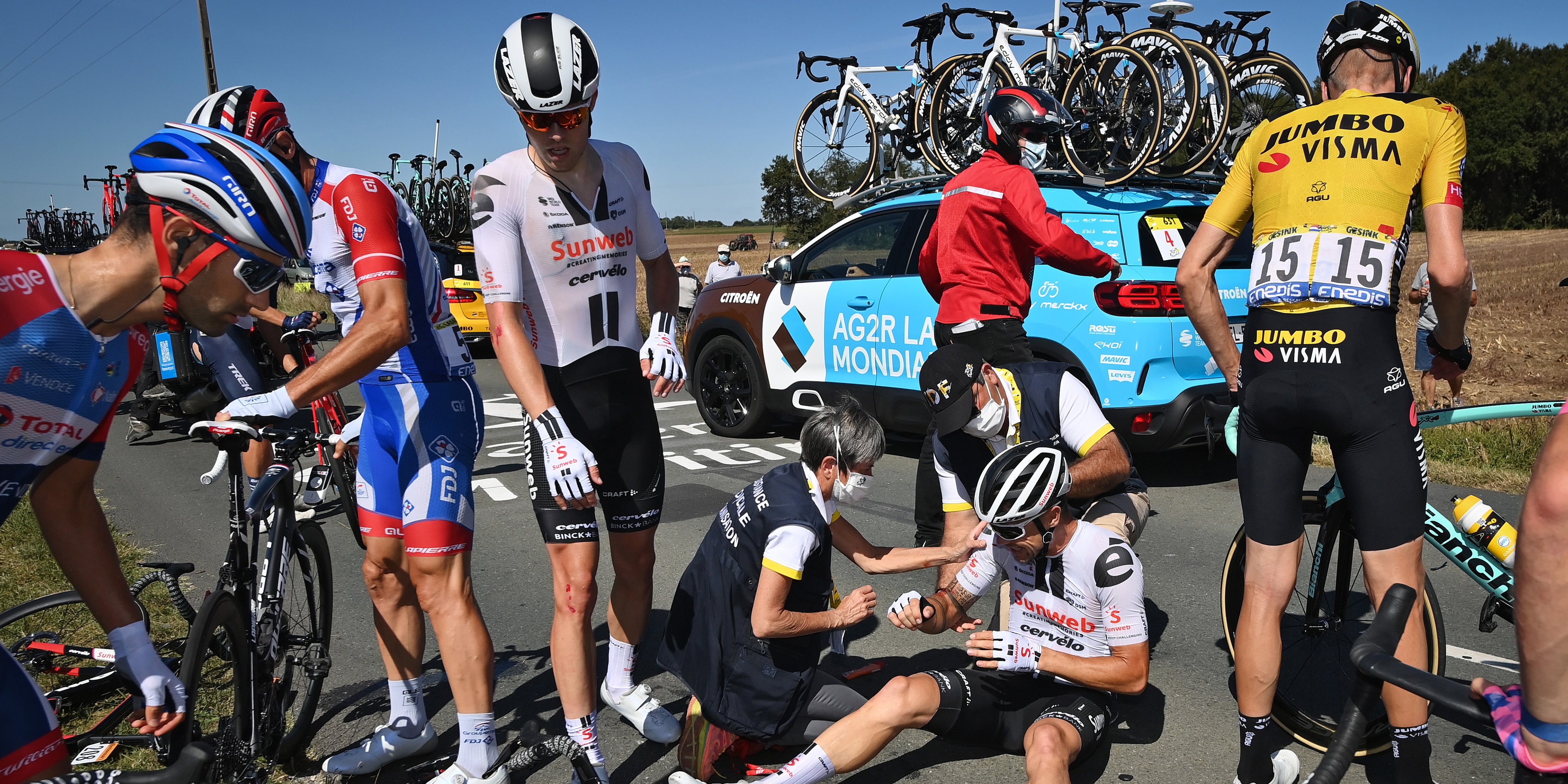 Gut 46 km vor dem Ziel kam es, ausgelöst durch einen unglücklichen Sturz des viermaligen Zeitfahr-Weltmeisters Tony Martin, zum ersten Massencrash. Eine Zuschauerin mit einem großen Pappschild brachte den 36-Jährigen zu Fall, daraufhin gingen mehrere Dutzend Fahrer zu Boden, darunter auch Alaphilippe und Roglic. Martin konnte das Rennen mit aufgeschlagenem Arm fortsetzen, für seinen deutschen Radprofi-Kollegen Jasha Sütterlin ist dagegen die Tour schon beendet. Der Freiburger konnte nicht mehr weiterfahren.