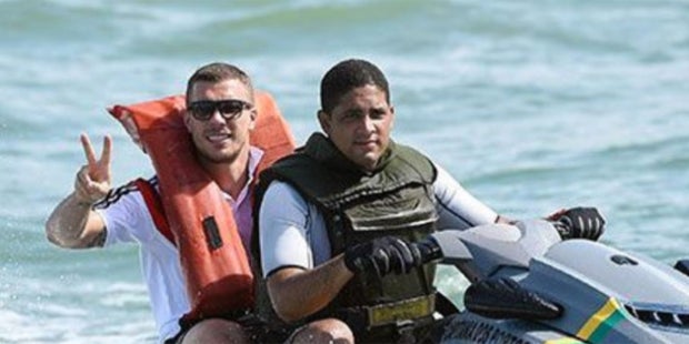 Auf dem Foto ist ein gut gelaunter Lukas Podolski mit Sonnenbrille und mit zum Victory-Zeichen gespreizten Fingern als Mitfahrer auf einem Jetski zu sehen - das Bild stammt von der Fußballweltmeisterschaft 2014 in Brasilien. "Breitbart" nutzt das Foto als Symbolbild für einen Artikel, in dem es heißt, die spanische Polizei habe einer Gruppe von Schleusern das Handwerk gelegt, die Menschen per Jetski über die Meerenge von Gibraltar nach Spanien gebracht haben sollen.