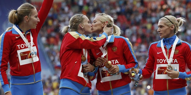 haben zwei russische Weltmeisterinnen empört Berichte zurückgewiesen, sie hätten mit der Aktion gegen das umstrittene Anti-Homosexuellen-Gesetz in ihrem Land protestiert. Solche Berichte seien beleidigend, sagte Xenia Ryschowa aus der siegreichen Staffel über 4 mal 400 m am Dienstag der Agentur Itar-Tass. Der Kuss auf dem Siegerpodest sei der großen Aufregung nach dem unerwarteten Erfolg geschuldet gewesen.