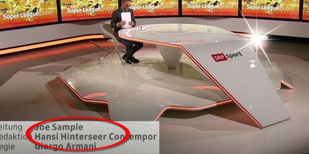 Beim Schweizer öffentlich-rechtlichen Sender SRF ist beim Abspann der Sportsendung "Super League Goool" ein lustiger Fehler passiert. Als die Namen der wichtigsten Personen der Produktions-Crew aufgeführt werden, staunten die Zuseher nicht schlecht. So soll ein gewisser Giorgio Armani Regie geführt haben und Joe Sample die Leitung innegehabt haben. Sample war ein berühmter US-amerikanischer Jazz-Sänger. Und als Krönung wird auch noch Hansi Hinterseer als Redaktionsverantwortlicher eingeblendet.