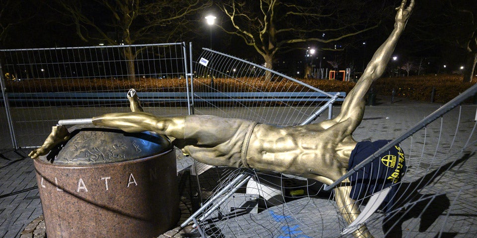 Die Statue des schwedischen Stürmerstars Zlatan Ibrahimovic vor dem Stadion des Malmö FF ist erneut stark beschädigt worden. Unbekannte sägten in der Nacht zum Sonntag die Bronzestatue oberhalb der Füße ab. Bilder zeigen, wie die drei Meter hohe Figur auf einem zusammengebrochenen Zaun liegt, der im Zuge der vorherigen Beschädigungen angebracht worden war.