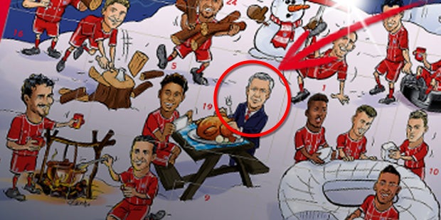 Die Bayern haben den Adventskalender allerdings schon in den Verkauf gegeben. Jetzt kommen eigens Aufkleber mit der Comic-Figur von Jupp Heynckes für die treuen Bayern-Fans berichtet die Bild. Fans können Ancelotti damit ganz einfach überkleben.