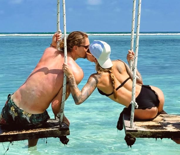 Besonders auffällig: Auf einer riesigen Schaukel mitten im türkisblauen Meer knutschen die beiden wie verliebte Teenager – ein perfektes Bild der Zweisamkeit.