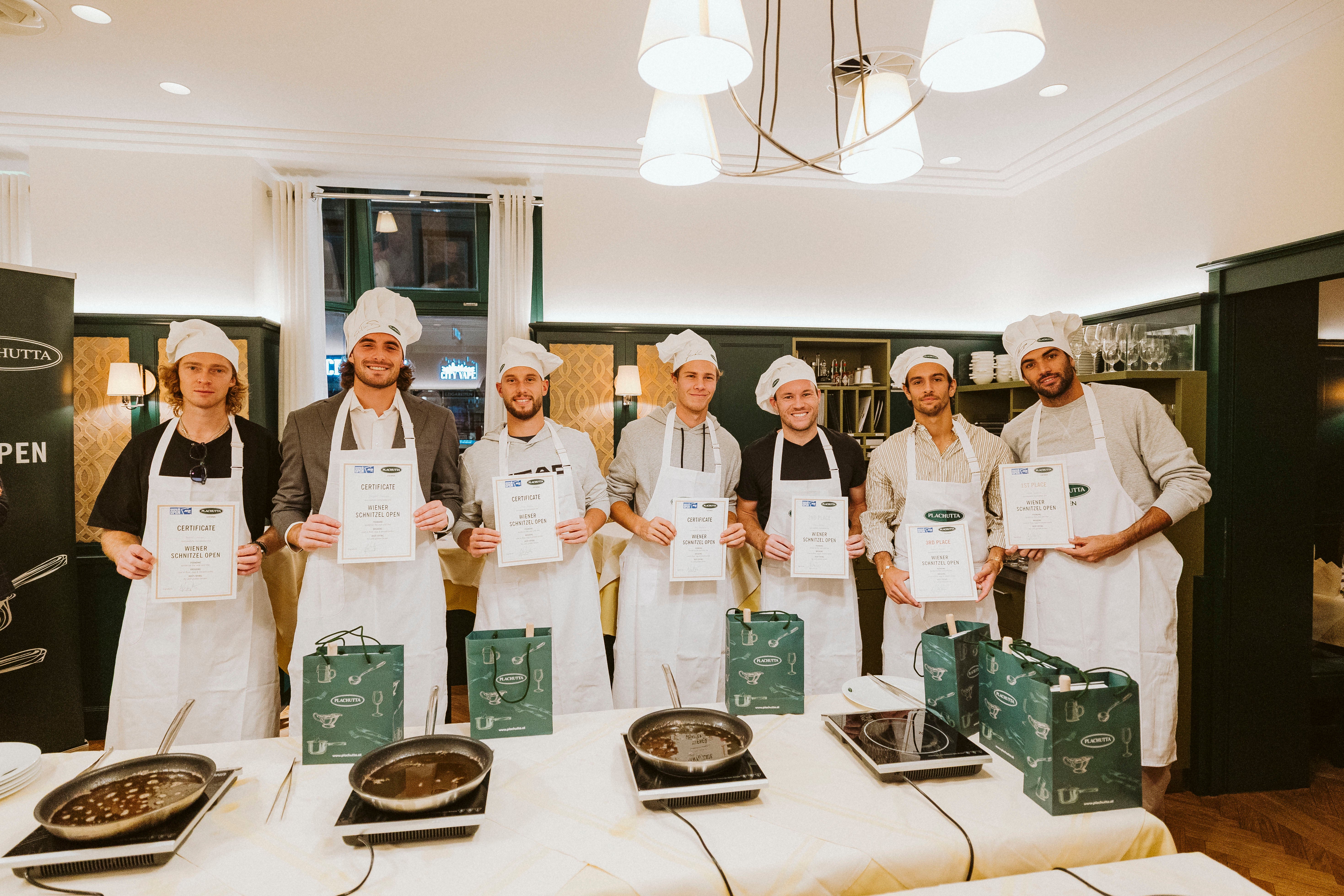 Denn beim traditionellen „Wiener Schnitzel Open“ im legendären Plachutta in der Wollzeile tauschten die Stars der Erste Bank Open ihre Tennisschläger gegen Bratpfannen – und bewiesen dabei überraschendes Talent. Mit dabei waren Filip Misolic, der am Dienstag (ab 13.30 Uhr, live auf ServusTV) auf den Argentinier Camilo Ugo Carabelli trifft, Lorenzo Musetti, Lucas Miedler, Andrey Rublev, Stefanos Tsitsipas, Joel Schwärzler und Matteo Berrettini.