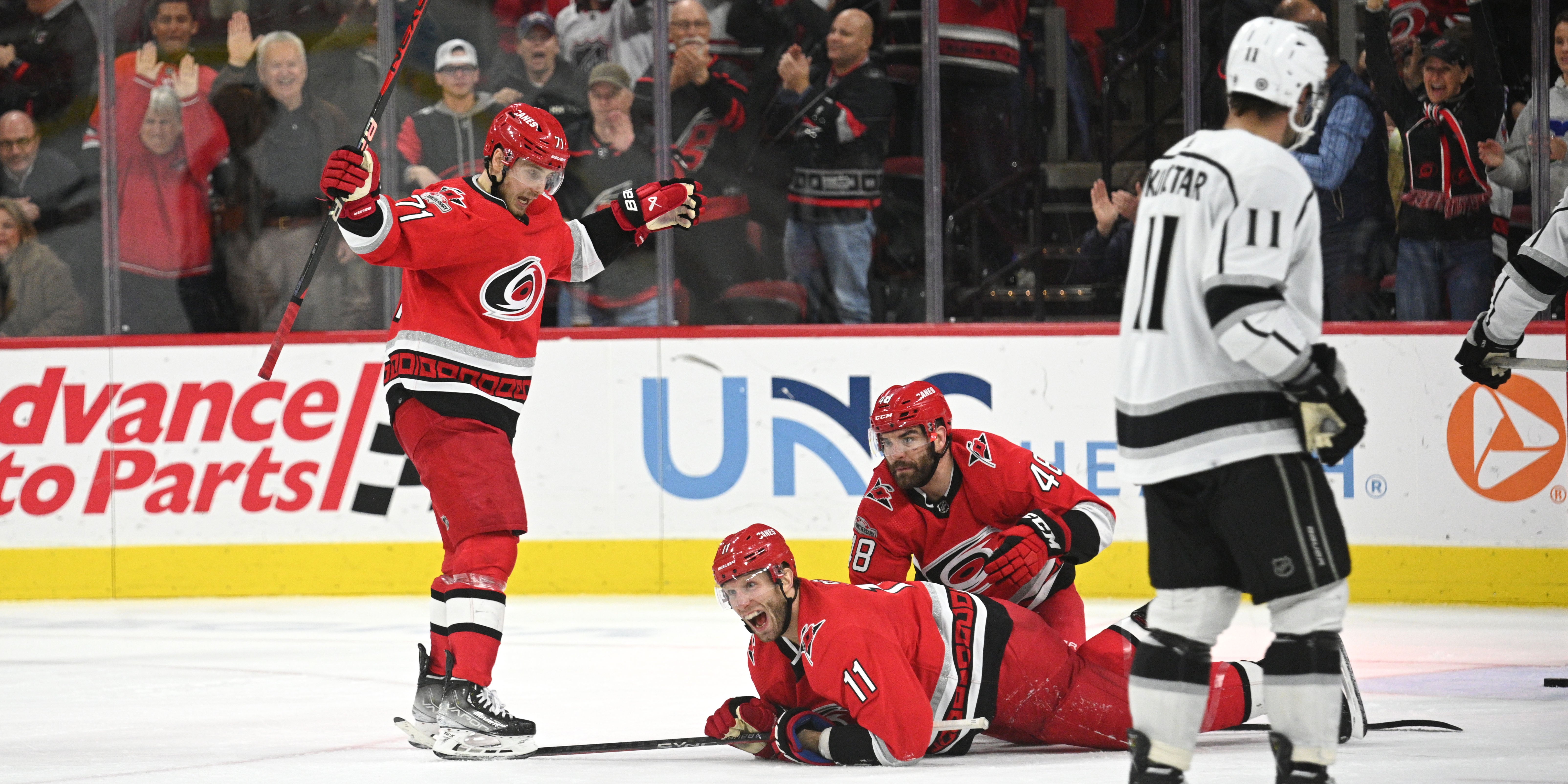 Die Gastgeber lagen im Duell mit den Los Angeles Kings in Raleigh nach zwei Dritteln bereits mit 1:4 zurück, retteten sich dank Toren von Paul Stastny, Jordan Staal und Teuvo Teravainen 7:29 Minuten vor der Schlusssirene aber noch in die Verlängerung. Dort fixierte Sebastian Aho mit einem Treffer im Powerplay den sechsten Sieg seines Teams in Folge.