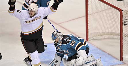 Den Anaheim Ducks ist zum Auftakt der NHL-Play-offs eine große Überraschung gelungen. Die Kalifornier gewannen am Donnerstag auswärts gegen die San Jose Sharks, das beste und heimstärkste Team der "regular season", das erste Spiel mit 2:0. Zum Mann des Abends wurde der 27-jährige Schweizer Goalie Jonas Hiller gewählt, der die Gastgeber mit 35 Paraden zur Verzweiflung brachte und in seinem ersten Play-off-Spiel in der NHL sein erstes Shutout feierte.