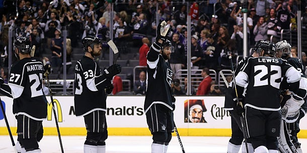 Im Duell der beiden jüngsten Stanley-Cup-Gewinner stellten die Kings im Staples Center die Weichen früh auf Sieg. Nach Treffern von Jake Muzzin (9.), Marian Gaborik (12.) und Dustin Brown (16.) im ersten Drittel legte Drew Doughty (33.) im zweiten zum 4:0 nach. Chicago kam durch Brandon Saad (35.) und Bryan Bickell (50.) nur noch auf zwei Tore heran, ehe Tanner Pearson in der vorletzten Minute ins leere Gehäuse für den Endstand sorgte.