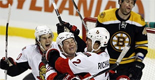 Im Dienstag-Schlager der nordamerikanischen Profi-Eishockeyliga NHL haben die Ottawa Senators bei den Boston Bruins einen 3:2-Erfolg gelandet. Matchwinner der Gäste war neben dem Schweizer Torhüter Martin Gerber (26 Paraden) Stürmer Jason Spezza mit zwei Toren. Dank des sechsten Siegs en suite hat Ottawa, das davor sieben Niederlagen in Folge kassiert hatte, eine eindrucksvolle Wende perfekt gemacht und die Führung auf Boston in der Northeast Division auf acht Zähler ausgebaut.