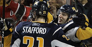 Mit Buh-Rufen waren die Sabres in die zweite Pause verabschiedet worden, doch im Schlussdrittel drehte die Mannschaft von Trainer Lindy Ruff groß auf. Jason Pominville und Jochen Hecht verkürzten innerhalb von 16 Sekunden (46.) auf 3:4, ehe der große Auftritt von Vanek kam. Jeweils nach Vorarbeit seiner Sturmpartnern Derek Roy und Drew Stafford gelang dem 24-Jährigen innerhalb von acht Minuten sein dritter Hattrick in der NHL - und der zweite gegen Tampa Bay, die er schon am 20. Februar (4:3 nach Verlängerung) mit drei Treffern erlegt hatte.