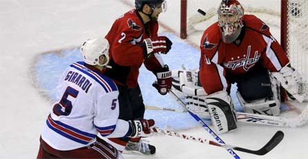 Die Washington Capitals haben am Freitag im NHL-Play-off einen 4:0-Erfolg gegen die New York Rangers gefeiert und damit ein vorzeitiges Ausscheiden verhindert. Rookie Simeon Varlamov (29) wehrte 20 Schüsse ab und schaffte sein zweites Shutout, die Capitals verkürzten in der best of seven-Serie auf 2:3. Die Rangers können allerdings am Sonntag auf eigenem Eis den Aufstieg fixieren.