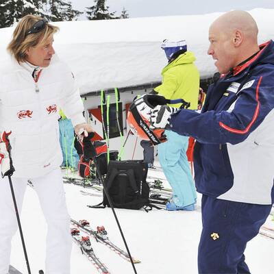 Michael Walchhofer, Österreichs letzter Streif-Sieger in der Abfahrt, gibt auch diesmal unseren Youngsters Tipps für die Abfahrt. Auf diesem Bild hat sich aber auch ein Schweizer dazugeschummelt.