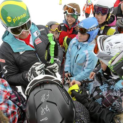 Im Ziel warten bereits Dutzende Autogrammjäger auf die Abfahrtshelden.