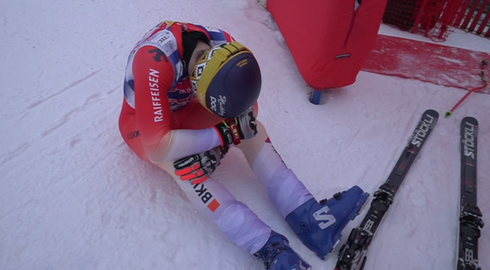 Der Schweizer erwischte die Hausbergkante nicht richtig, fuhr an einem Tor vorbei. Im Ziel wurde dann klar: Er hat sich dabei wohl verletzt.