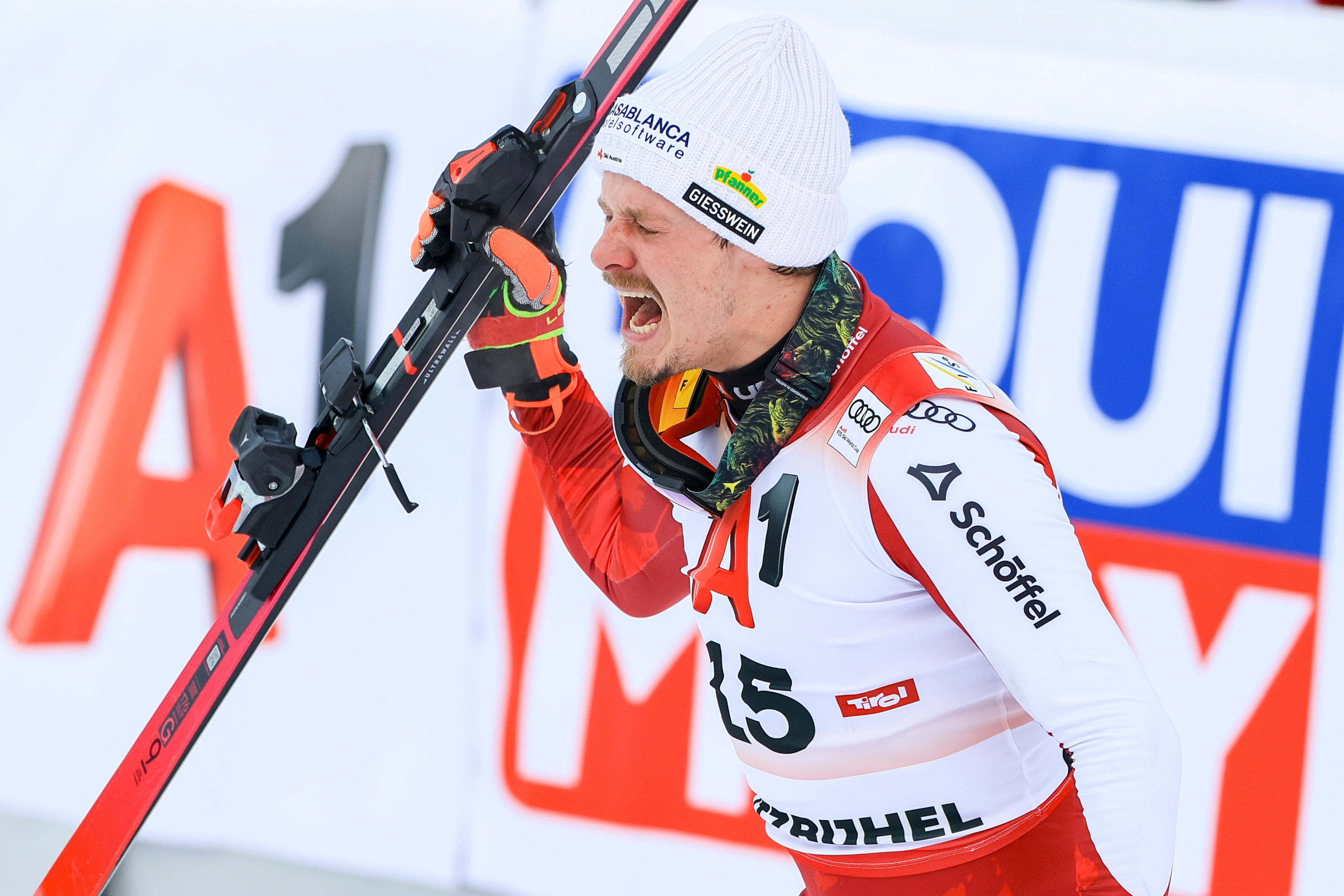Große Emotionen bei Manuel Feller nach seinem Sieg in Kitzbühel.